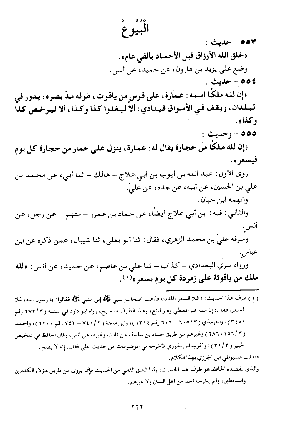 554 - حَدِيث: " إِن لله ملكا اسْمه: عمَارَة، على فرس من ياقوت، طوله مد بَصَره، يَدُور فِي الْبلدَانِ، وَيقف فِي الْأَسْوَاق فينادي: أَلا ليغلوا كَذَا وَكَذَا، أَلا ليرخص كَذَا وَكَذَا ".