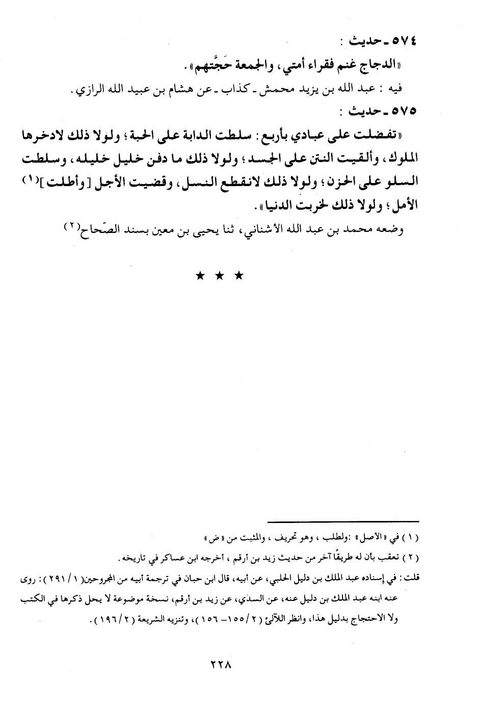 575 - حَدِيث: " تفضلت على عبَادي بِأَرْبَع: سلطت الدَّابَّة على الْحبَّة؛ وَلَوْلَا ذَلِك لادخرها الْمُلُوك، وألقيت النتن على الْجَسَد؛ وَلَوْلَا ذَلِك مَا دفن خَلِيل خَلِيله، وسلطت السلو على الْحزن؛ وَلَوْلَا ذَلِك لانقطع النَّسْل، وقضيت الْأَجَل [وأطلت] الأمل؛ وَلَوْلَا ذَلِك لخربت الدُّنْيَا ". وَضعه مُحَمَّد بن عبد الله الْأُشْنَانِي، ثَنَا يحيى بن معِين بِسَنَد الصِّحَاح.