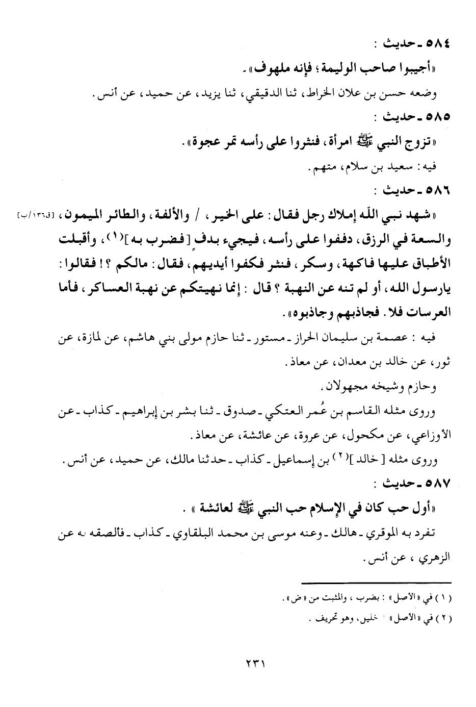 586 - حَدِيث: " شهد نَبِي الله إملاك رجل فَقَالَ: على الْخَيْر، / والألفة، والطائر الميمون، وَالسعَة فِي الرزق، دففوا على رَأسه، فَيَجِيء بدف [فَضرب بِهِ] ، وَأَقْبَلت الأطباق عَلَيْهَا فَاكِهَة، وسكر، فنثر فكفوا أَيْديهم، فَقَالَ: مالكم؟ ! فَقَالُوا: يَا رَسُول الله، أَو لم تنه عَن النهبة؟ قَالَ: إِنَّمَا نَهَيْتُكُمْ عَن نهبة العساكر، فَأَما العرسات فَلَا. فجاذبهم وجاذبوه ". فِيهِ: عصمَة بن سُلَيْمَان الحراز - مَسْتُور - ثَنَا حَازِم مولى بني هَاشم، عَن لمازة، عَن ثَوْر، عَن خَالِد بن معدان، عَن معَاذ. وحازم وَشَيْخه مَجْهُولَانِ. وروى مثله الْقَاسِم بن عمر الْعَتكِي - صَدُوق - ثَنَا بشر بن إِبْرَاهِيم - كَذَّاب - عَن الْأَوْزَاعِيّ، عَن مَكْحُول، عَن عُرْوَة، عَن عَائِشَة، عَن معَاذ. وروى مثله [خَالِد] بن إِسْمَاعِيل - كَذَّاب - حَدثنَا مَالك، عَن حميد، عَن أنس.