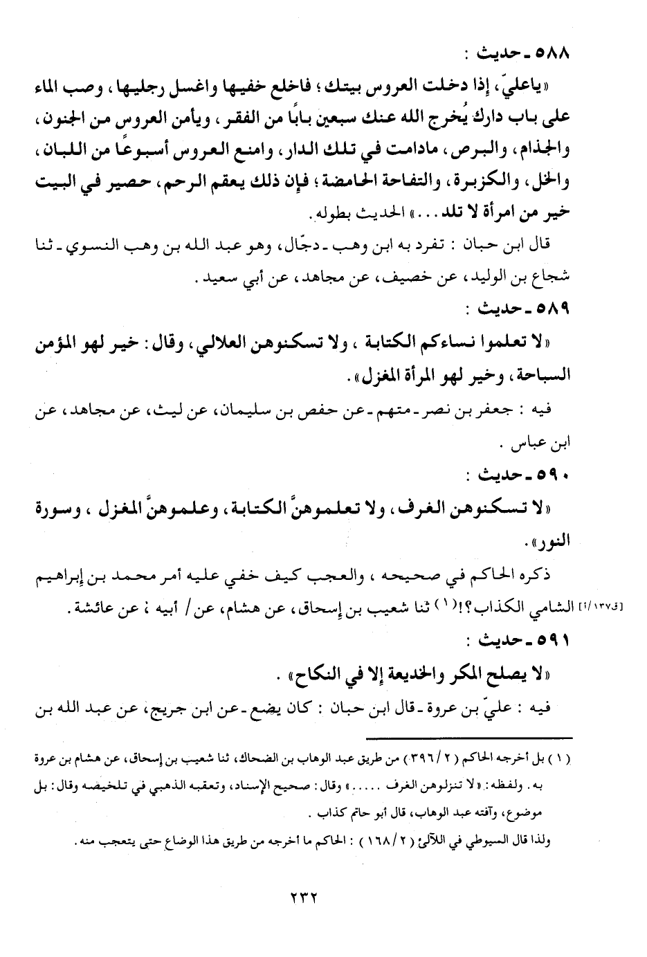 588 - حَدِيث: " يَا عَليّ، إِذا دخلت الْعَرُوس بَيْتك؛ فاخلع خفيها واغسل رِجْلَيْهَا، وصب المَاء على بَاب دَارك يخرج الله عَنْك سبعين بَابا من الْفقر، ويأمن الْعَرُوس من الْجُنُون، والجذام، والبرص، مَا دَامَت فِي تِلْكَ الدَّار، وامنع الْعَرُوس أسبوعاً من اللبان، والخل، والكزبرة، والتفاحة الحامضة؛ فَإِن ذَلِك يعقم الرَّحِم، حَصِير فِي الْبَيْت خير من امْرَأَة لَا تَلد ... " الحَدِيث بِطُولِهِ. قَالَ ابْن حبَان: تفرد ابْن وهب - دجال، وَهُوَ عبد الله بن وهب النسوي - ثَنَا شُجَاع بن الْوَلِيد، عَن خصيف، عَن مُجَاهِد، عَن أبي سعيد.