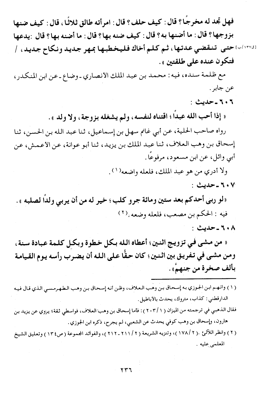608 - حَدِيث: " من مَشى فِي تَزْوِيج اثْنَيْنِ؛ أعطَاهُ الله بِكُل خطْوَة وَبِكُل كلمة عبَادَة سنة، وَمن مَشى فِي تَفْرِيق بَين اثْنَيْنِ؛ كَانَ حَقًا على الله أَن يضْرب رَأسه يَوْم الْقِيَامَة بِأَلف صَخْرَة من جَهَنَّم ".