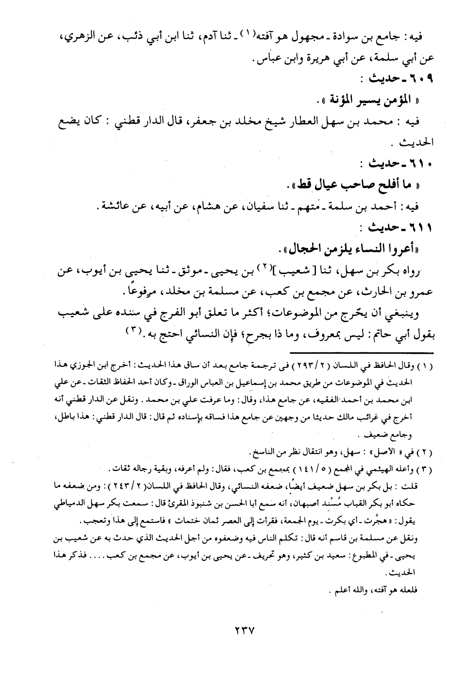 611 - حَدِيث: " أعروا النِّسَاء يلزمن الحجال ". رَوَاهُ بكر بن سهل، ثَنَا [شُعَيْب] بن يحيى - موثق - ثَنَا يحيى بن أَيُّوب، عَن عَمْرو بن الْحَارِث، عَن مجمع بن كَعْب، عَن مسلمة بن مخلدا، مَرْفُوعا. وَيَنْبَغِي أَن يخرج من الموضوعات؛ أَكثر مَا تعلق أَبُو الْفرج فِي سَنَده على شُعَيْب بقول أبي حَاتِم: لَيْسَ بِمَعْرُوف، وماذا بِجرح؛ فَإِن النَّسَائِيّ احْتج بِهِ.