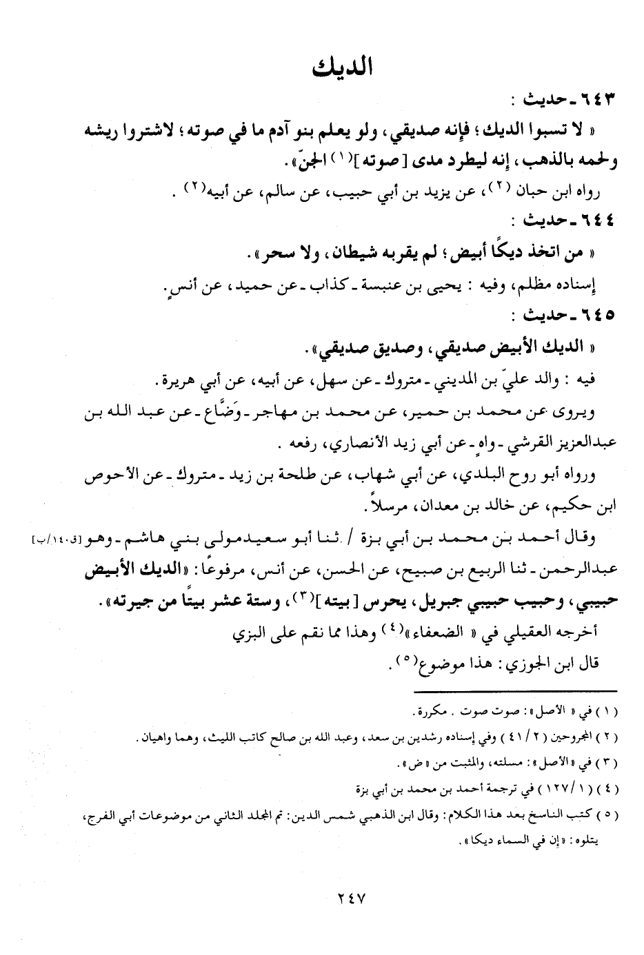 643 - حَدِيث: " لَا تسبوا الديك؛ فَإِنَّهُ صديقي، وَلَو يعلم بَنو آدم مَا فِي صَوته؛ لاشتروا ريشه ولحمه بِالذَّهَب، إِنَّه ليطرد مدى [صَوته] الْجِنّ ". رَوَاهُ ابْن حبَان، عَن يزِيد بن أبي حبيب، عَن سَالم، عَن أَبِيه.