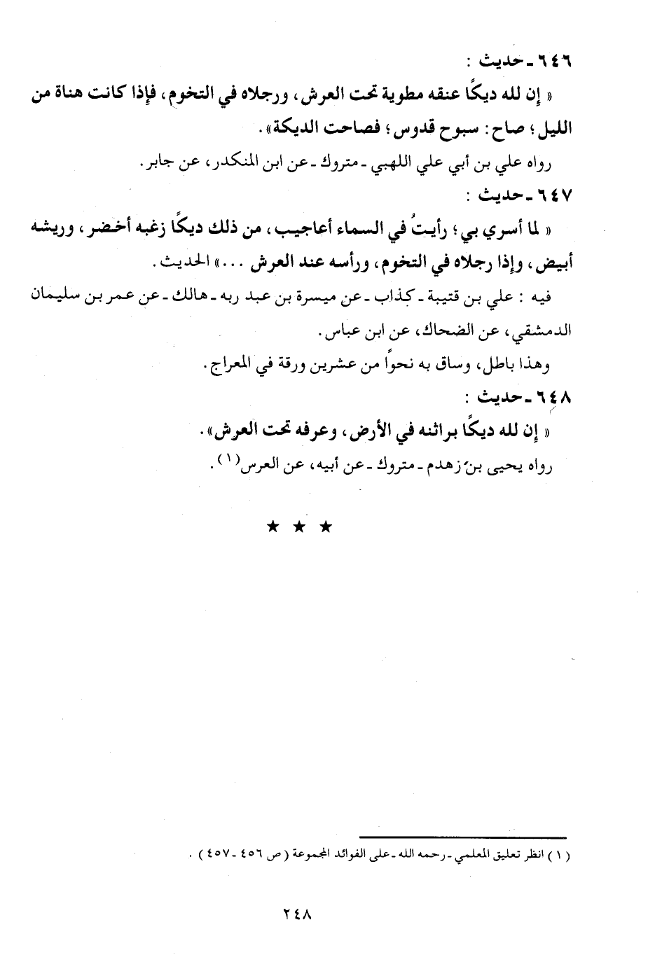 647 - حَدِيث: " لما أسرِي بِي؛ رَأَيْت فِي السَّمَاء أعاجب، من ذَلِك ديكاً زغبه أَخْضَر، وريشه أَبيض، وَإِذا رِجْلَاهُ فِي التخوم، وَرَأسه عِنْد الْعَرْش ... " الحَدِيث. فِيهِ: عَليّ بن قُتَيْبَة - كَذَّاب - عَن ميسرو بن عبد ربه - هَالك - عَن عمر بن سُلَيْمَان الدِّمَشْقِي، عَن الضَّحَّاك، عَن ابْن عَبَّاس. وَهَذَا بَاطِل، وسَاق بِهِ نَحوا من عشْرين ورقة فِي الْمِعْرَاج.