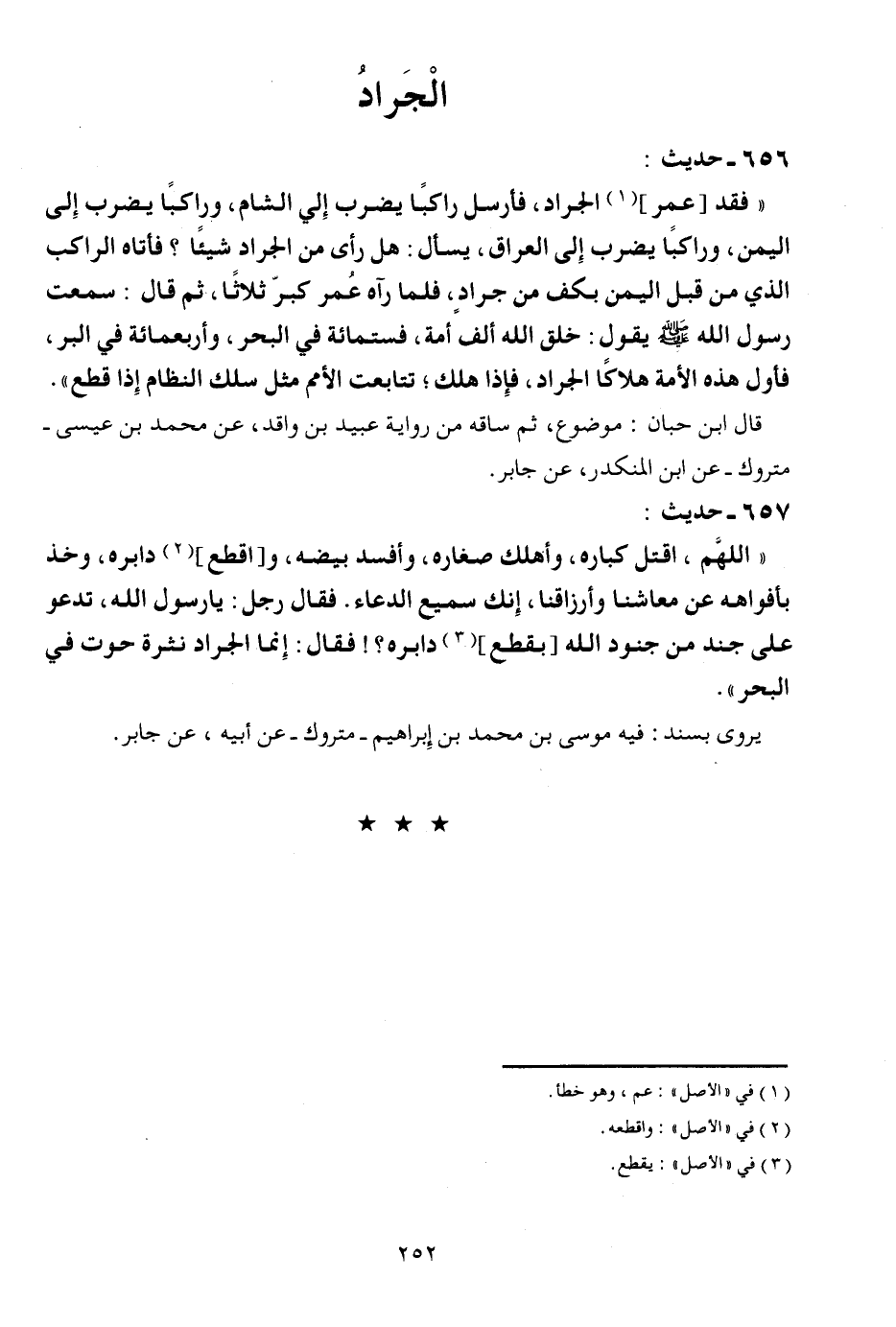 657 - حَدِيث: " اللَّهُمَّ، اقْتُل كباره، وَأهْلك صغاره، وأفسد بيضه، و [اقْطَعْ] دابره، وَخذ بأفواهه عَن معاشنا وأرزاقنا، إِنَّك سميع الدُّعَاء. فَقَالَ رجل: يَا رَسُول الله، تَدْعُو على جند من جنود الله [بِقطع] دابره؟ ! فَقَالَ: إِنَّمَا الْجَرَاد نثرة حوت فِي الْبَحْر ". يرْوى بِسَنَد: فِيهِ مُوسَى بن مُحَمَّد بن إِبْرَاهِيم - مَتْرُوك - عَن أَبِيه، عَن جَابر.