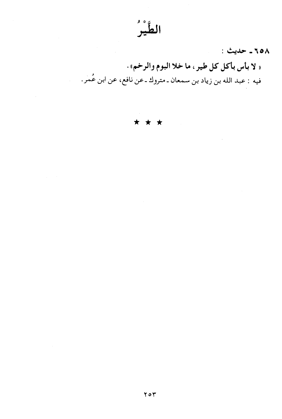658 - حَدِيث: " لَا بَأْس بِأَكْل كل طير، مَا خلا البوم والرخم ". فِيهِ: عبد الله بن زِيَاد بن سمْعَان - مَتْرُوك - عَن نَافِع، عَن ابْن عمر.