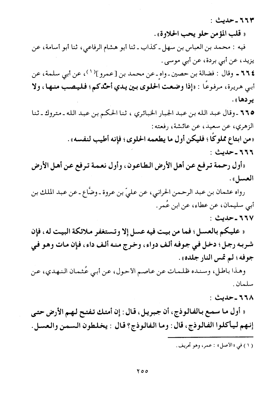 667 - حَدِيث: " عَلَيْكُم بالعسل؛ فَمَا من بَيت فِيهِ عسل إِلَّا وَتَسْتَغْفِر مَلَائِكَة الْبَيْت لَهُ، فَإِن شربة رجل؛ دخل فِي جَوْفه ألف دَوَاء، وَخرج مِنْهُ ألف دَاء، فَإِن مَاتَ وَهُوَ فِي جَوْفه؛ لم تمس النَّار جلده ". وَهَذَا بَاطِل، وَسَنَده ظلمات عَن عَاصِم الْأَحول، عَن أبي عُثْمَان النَّهْدِيّ، عَن سلمَان.
