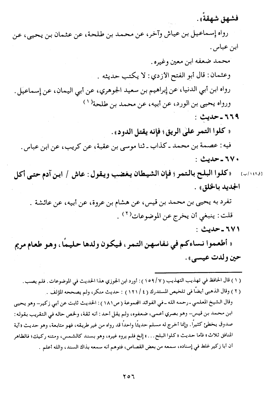 670 - حَدِيث: " كَلَوْ البلح بِالتَّمْرِ؛ فَإِن الشَّيْطَان يغْضب وَيَقُول: عَاشَ / ابْن آدم حَتَّى أكل الْجَدِيد بالخلق ". تفرد بِهِ يحيى بن مُحَمَّد بن قيس، عَن هِشَام بن عُرْوَة، عَن أَبِيه، عَن عَائِشَة. قلت: يَنْبَغِي أَن يخرج عَن الموضوعات.