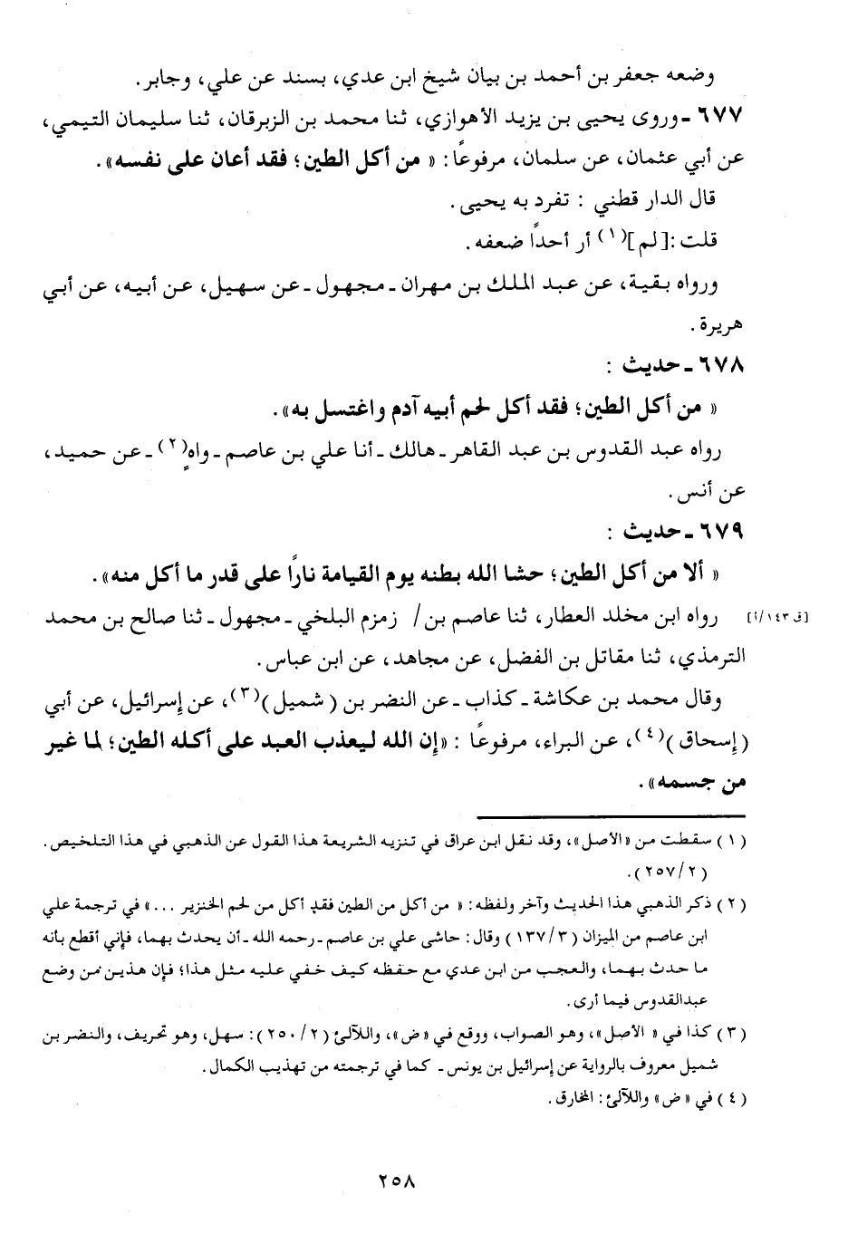 677 - وروى يحيى بن يزِيد الْأَهْوَازِي، ثَنَا مُحَمَّد بن الزبْرِقَان، ثَنَا سُلَيْمَان التَّيْمِيّ، عَن أ [ي عُثْمَان، عَن سلمَان، مَرْفُوعا: " من أكل الطين؛ فقد أعَان على نَفسه ". قَالَ الدَّارَقُطْنِيّ: تفرد بِهِ يحيى. قلت: [لم] أر أحدا ضعفه. وَرَوَاهُ بَقِيَّة، عَن عبد الْملك بن مهْرَان - مَجْهُول - عَن سُهَيْل، عَن أَبِيه، عَن أبي هُرَيْرَة.