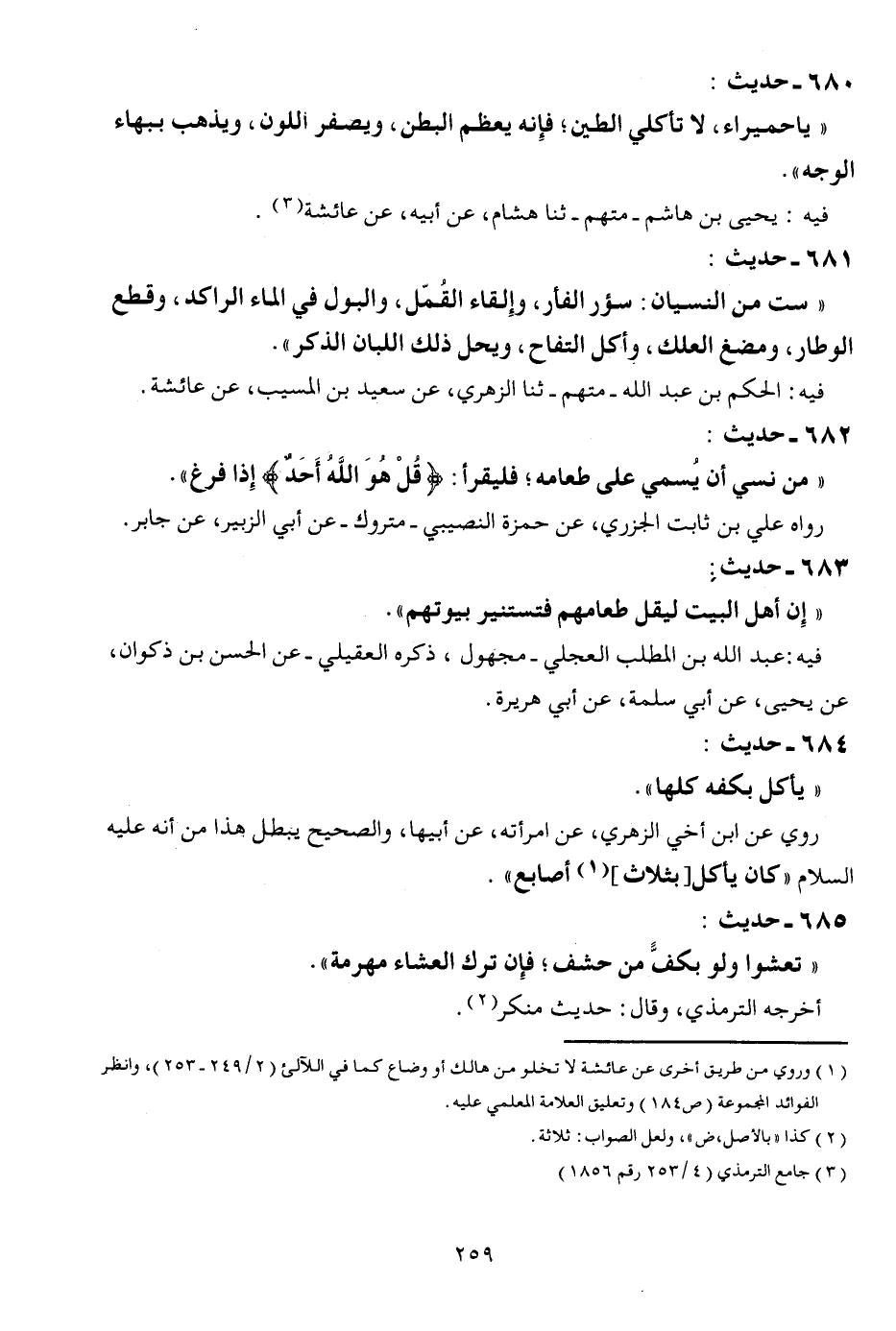 685 - حَدِيث: " تعشوا وَلَو بكف من حشف؛ فَإِن ترك الْعشَاء مهرمة ". أخرجه التِّرْمِذِيّ، وَقَالَ: حَدِيث مُنكر.