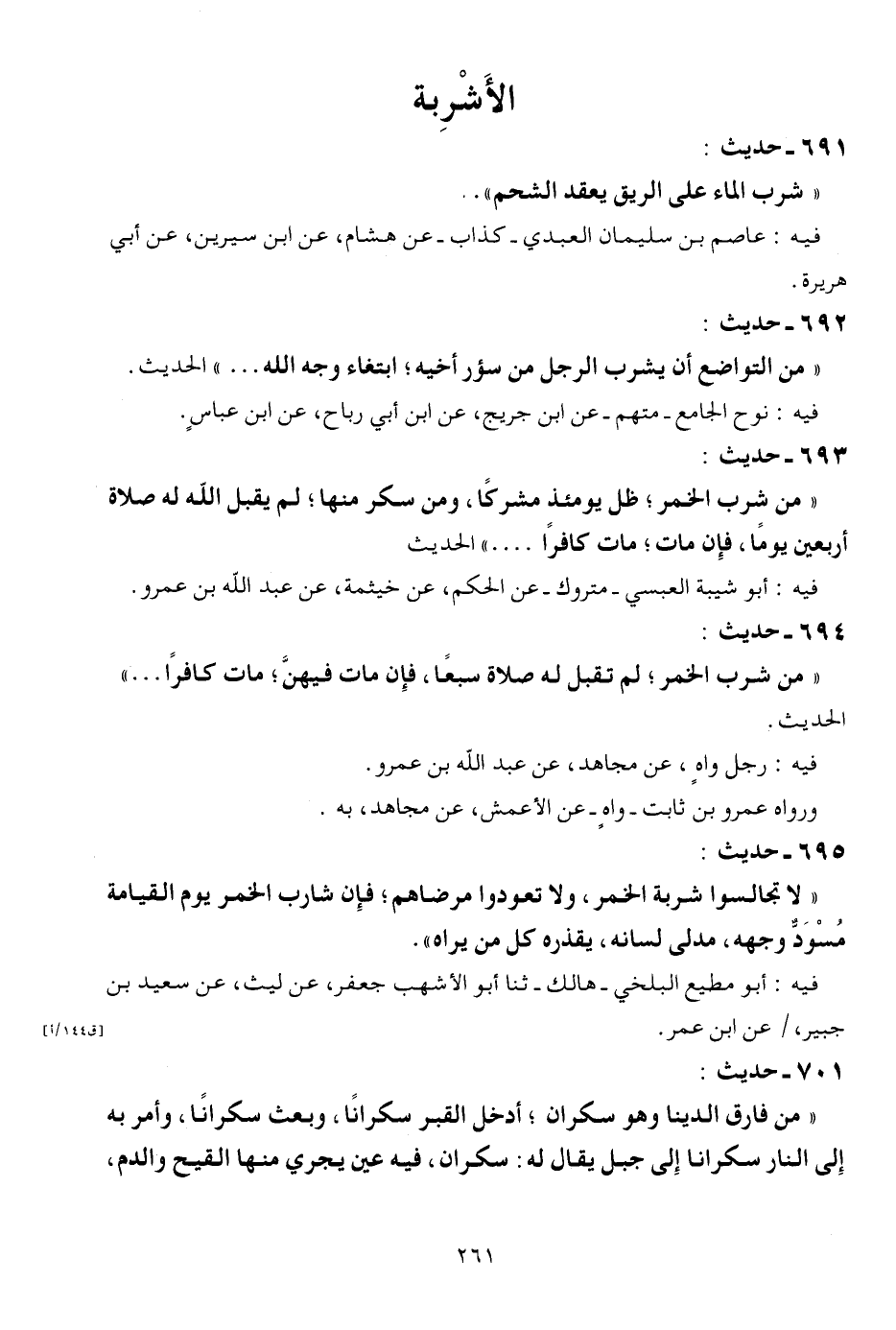 695 - حَدِيث:: لَا تجالسوا شربة الْخمر، وَلَا تعودوا مرضاهم، فَإِن شَارِب الْخمر يَوْم الْقِيَامَة مسود وَجهه، مدلى لِسَانه، يقذره كل من يرَاهُ ". فِيهِ: أَبُو مُطِيع الْبَلْخِي - هَالك - ثَنَا أَبُو الْأَشْهب جَعْفَر، عَن لَيْث، عَن سعيد بن جُبَير، / عَن ابْن عمر.