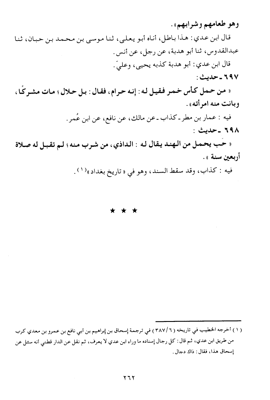 698 - حَدِيث: " حب يحمل من الْهِنْد يُقَال لَهُ: الداذي، من شرب مِنْهُ؛ لم تقبل لَهُ صَلَاة أَرْبَعِينَ سنة ". فِيهِ: كَذَّاب، وَقد سقط السَّنَد، وَهُوَ فِي " تَارِيخ بَغْدَاد ".