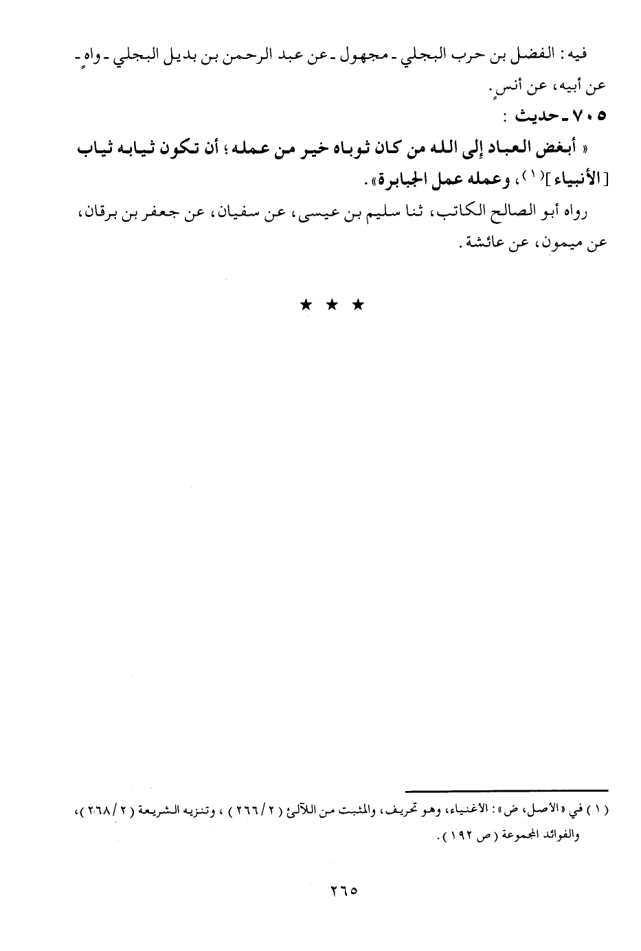 705 - حَدِيث: " أبْغض الْعباد إِلَى الله من كَانَ ثوباه خير من عمله؛ أَن تكون ثِيَابه ثِيَاب [الْأَنْبِيَاء] ، وَعَمله عمل الْجَبَابِرَة ". رَوَاهُ أَبُو الصَّالح الْكَاتِب، ثَنَا سليم بن عِيسَى، عَن سُفْيَان، عَن جَعْفَر بن برْقَان عَن مَيْمُون، عَن عَائِشَة.