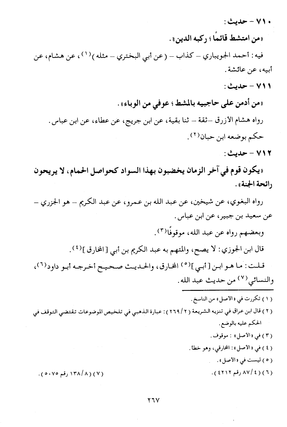 712 - حَدِيث: " يكون قوم فِي آخر الزَّمَان يخضبون بِهَذَا السوَاد كحواصل الْحمام، لَا يريحون رَائِحَة الْجنَّة ". رَوَاهُ الْبَغَوِيّ، عَن شيخين، عَن عبد الله بن عَمْرو، عَن عبد الْكَرِيم - هُوَ الْجَزرِي - عَن سعيد بن جُبَير، عَن ابْن عَبَّاس. وَبَعْضهمْ رَوَاهُ عَن عبد الله مَوْقُوفا. قَالَ ابْن الْجَوْزِيّ: لَا يَصح، وَالْمُتَّهَم بِهِ عبد الْكَرِيم بن أبي [الخارق] . قلت: مَا هُوَ ابْن [أبي] الْمخَارِق، والْحَدِيث صَحِيح أخرجه أَبُو دَاوُد، وَالنَّسَائِيّ من حَدِيث عبد الله.