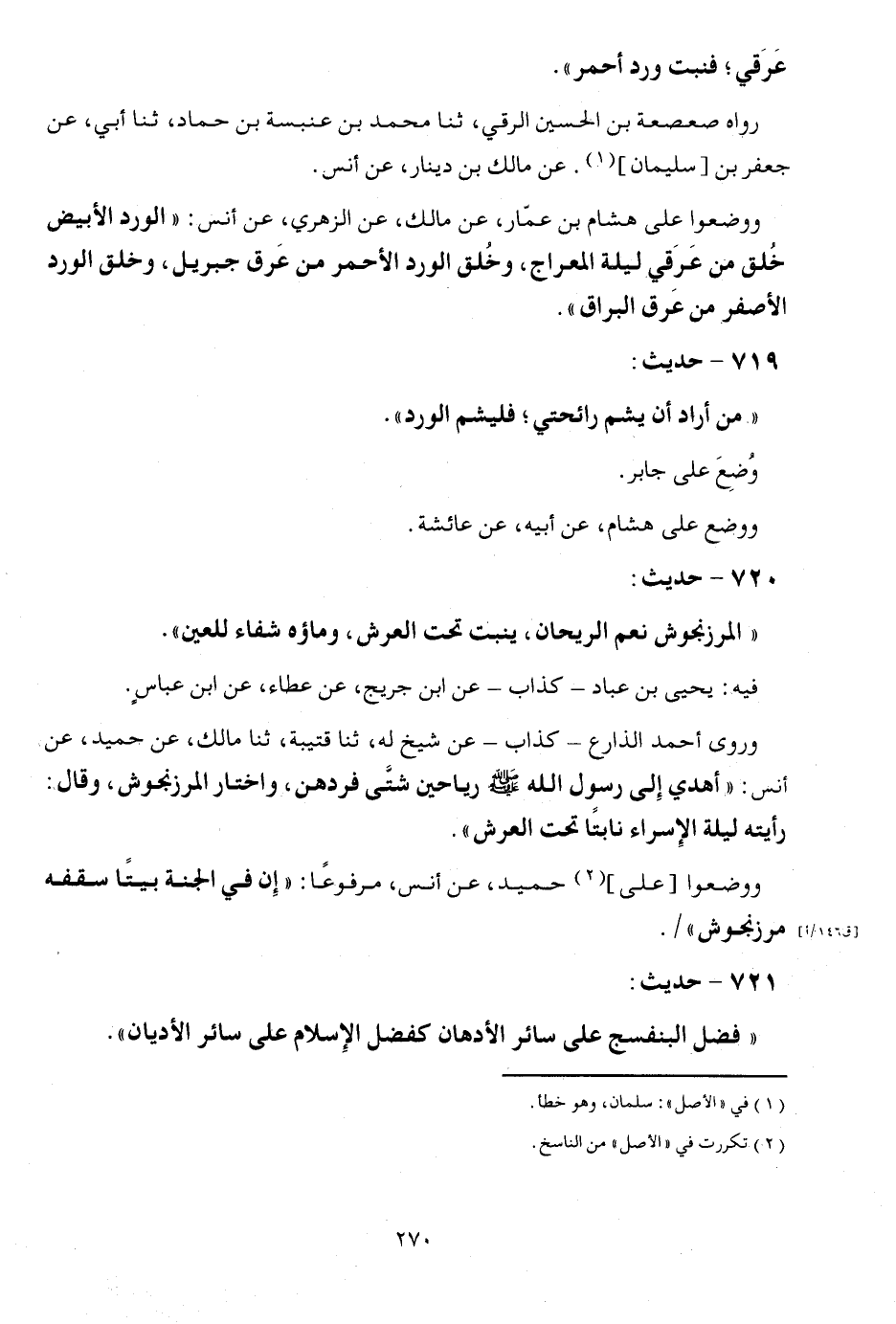 720 - حَدِيث: " المرزنجوش نعم الريحان، ينْبت تَحت الْعَرْش، وماؤه شِفَاء الْعين ". فِيهِ: يحيى بن عباد - كَذَّاب - عَن ابْن جريج، عَن عَطاء، عَن ابْن عَبَّاس. وروى أَحْمد الذِّرَاع - كَذَّاب - عَن شيخ لَهُ، ثَنَا قُتَيْبَة، ثَنَا مَالك، عَن حميد، عَن أنس: " أهدي إِلَى رَسُول الله صلى الله عَلَيْهِ وَسلم رياحين شَتَّى فردهن، وَاخْتَارَ المرزنجوش، وَقَالَ: رَأَيْته لَيْلَة الْإِسْرَاء نابتاً تَحت الْعَرْش ". وَوَضَعُوا [على] حميد، عَن أنس، مَرْفُوعا: " إِن فِي الْجنَّة بَيْتا سقفه مرزنجوش " /.