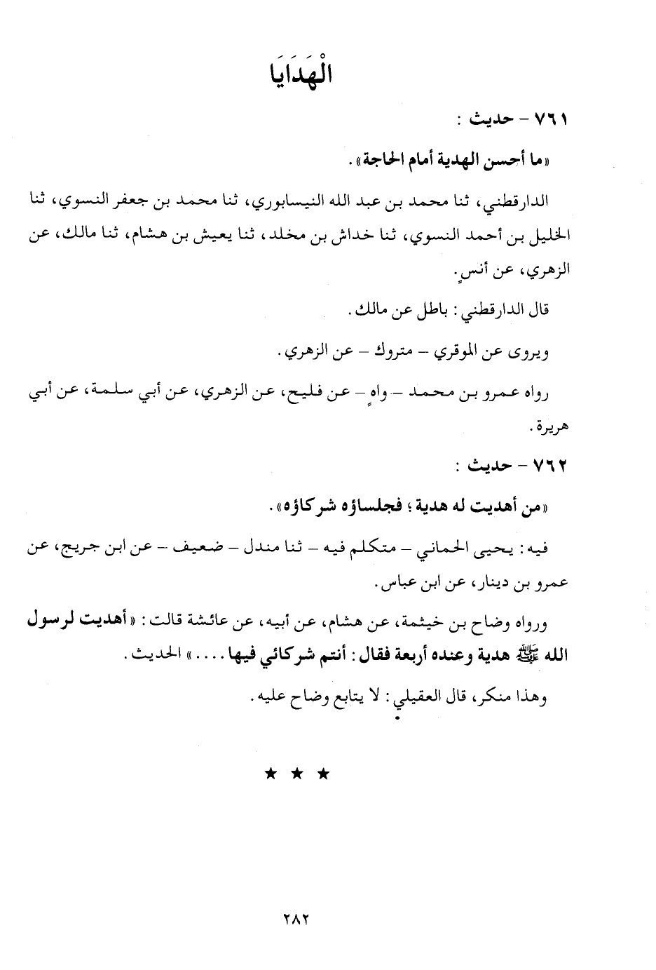 761 - حَدِيث " مَا أحسن الْهَدِيَّة أَمَام الْحَاجة " الداقطني ثَنَا مُحَمَّد بن عبد الله النَّيْسَابُورِي ثَنَا مُحَمَّد بن جَعْفَر النسوي ثَنَا الْخَلِيل بن احْمَد النسوي، ثَنَا خِدَاش بن مخلد ثَنَا يعِيش بن هِشَام ثَنَا مَالك عَن الزُّهْرِيّ عَن أنس قَالَ الداقطني بَاطِل عَن مَالك ويروي عَن الْمقري مَتْرُوك عَن الزُّهْرِيّ رَوَاهُ عمر بن مُحَمَّد واه عَن فليح عَن الزُّهْرِيّ عَن أبي سَلمَة عَن أبي هُرَيْرَة