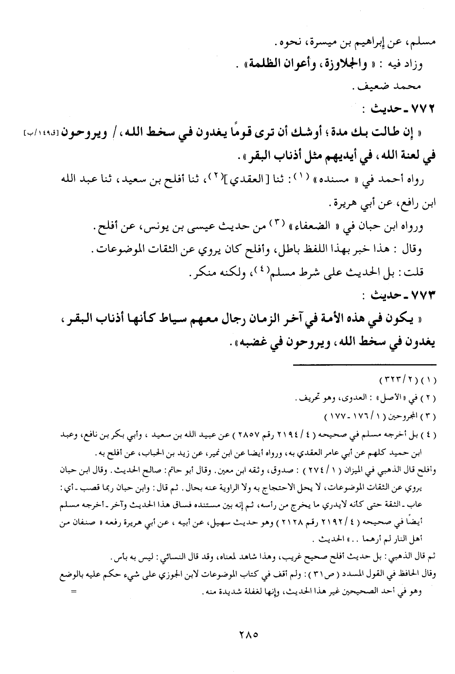 772 - حَدِيث: " إِن طَالَتْ بك مُدَّة أوشك أَن ترى قوما يَغْدُونَ فِي سخط الله، وَيَرُوحُونَ فِي لعنة الله فِي أَيْديهم مثل أَذْنَاب الْبَقر ". رَوَاهُ أَحْمد فِي مُسْنده ثَنَا العقيدي ثَنَا أَفْلح بن سعيد ثَنَا عبد الله ابْن رَافع عَن أبي هُرَيْرَة وَرَوَاهُ ابْن حبَان فِي الضُّعَفَاء من حَدِيث عِيسَى بن يُونُس عَن أَفْلح وَقَالَ هَذَا خبر بِهَذَا اللَّفْظ بَاطِل وأفلح كَانَ يرْوى عَن الثِّقَات الموضوعات قلت بل الحَدِيث على شَرط مُسلم وَلكنه مُنكر.