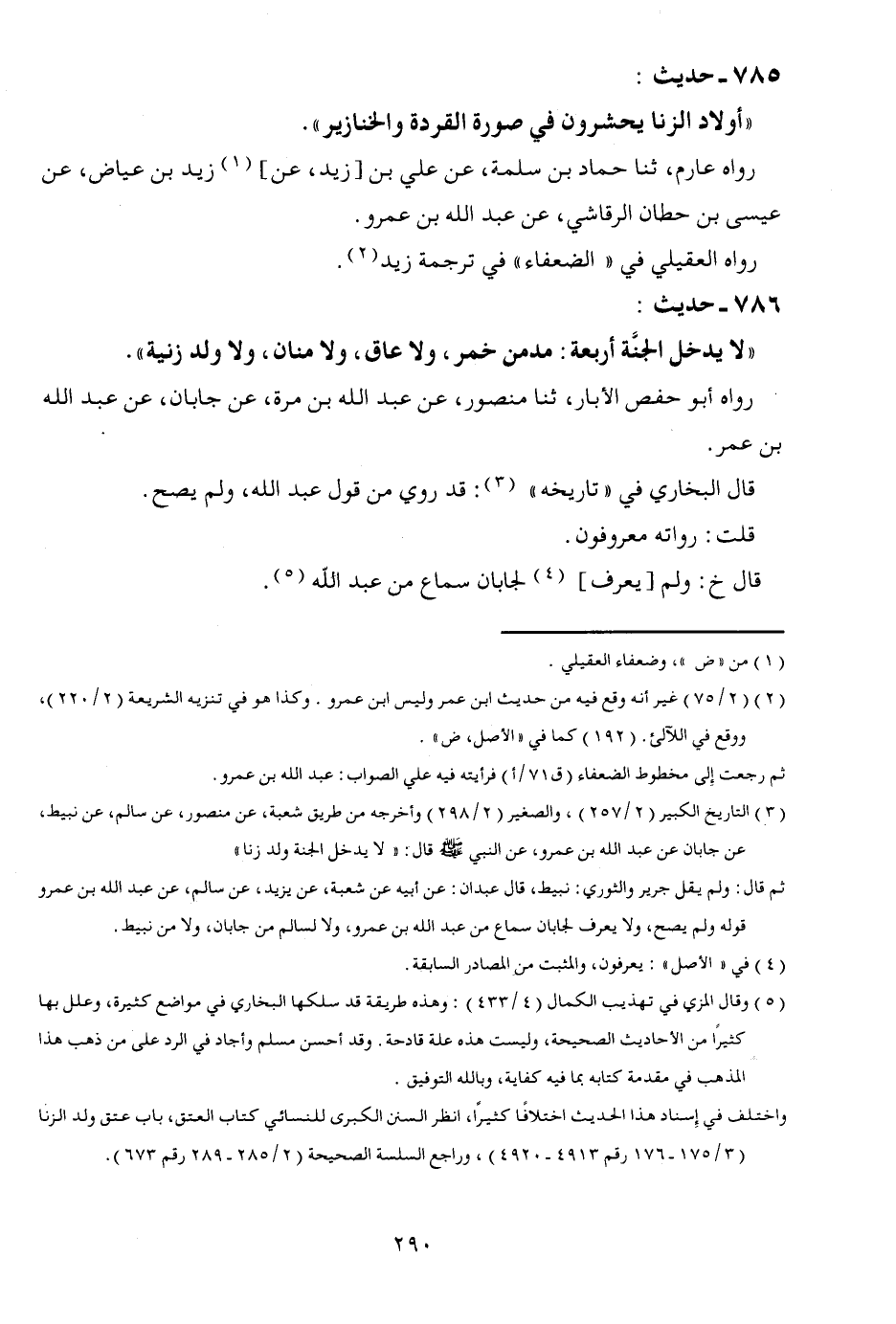 785 - حَدِيث " أَوْلَاد الزِّنَا يحشرون فِي صُورَة القردة والخنازير ". رَوَاهُ عَارِم ثَنَا حَمَّاد بن سَلمَة عَن عَليّ بن زيد عَن زيد بن عِيَاض عَن عِيسَى بن حطَّان الرقاشِي عَن عبد الله بن عَمْرو رَوَاهُ الْعقيلِيّ فِي الضُّعَفَاء فِي تَرْجَمَة زيد.