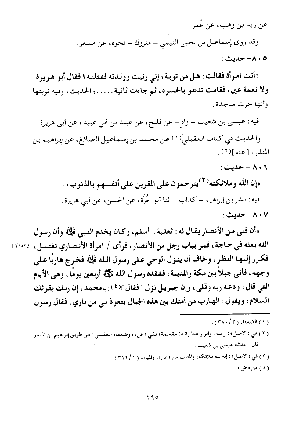 805 - حَدِيث: " أَتَت امْرَأَة فَقَالَت: هَل من تَوْبَة إِنِّي زَنَيْت وولدته فَقتلته فَقَالَ أَبُو هُرَيْرَة وَلَا نعْمَة عين فَقَامَتْ تَدْعُو بالحسرة ثمَّ جَاءَت ثَانِيَة ... " الحَدِيث وَفِيه توبتها وَأَنَّهَا خرت سَاجِدَة. فِيهِ عِيسَى بن شُعَيْب واه عَن فليح عَن عبيد بن ابي عبيد عَن أبي هُرَيْرَة والْحَدِيث فِي كتاب الْعقلِيّ عَن مُحَمَّد بن إِسْمَاعِيل الصَّائِغ عَن إِبْرَاهِيم بن الْمُنْذر عَنهُ