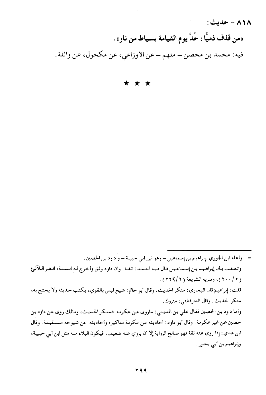 818 - " من قذف ذِمِّيا حد يَوْم الْقِيَامَة بيساط من نَار ". فِيهِ مُحَمَّد بن مُحصن مُتَّهم عَن الْأَوْزَاعِيّ عَن مَكْحُول عَن وَاثِلَة.