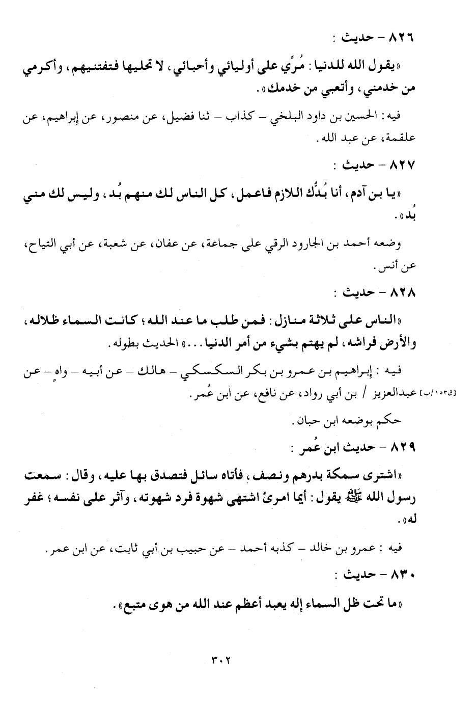 828 - حَدِيث: " النَّاس على ثَلَاثَة منَازِل: فَمن طلب مَا عِنْد الله، كَانَت السَّمَاء ظلاله، وَالْأَرْض فرَاشه، لم يهتم بِشَيْء من أَمر الدُّنْيَا ... " الحَدِيث بِطُولِهِ. فِيهِ: إِبْرَاهِيم بن عَمْرو بن بكر السكْسكِي - هَالك عَن أَبِيه واه عَن عبد الْعَزِيز بن ابي رواد عَن نَافِع عَن ابْن عمر. حكم بِوَضْعِهِ ابْن حبَان.