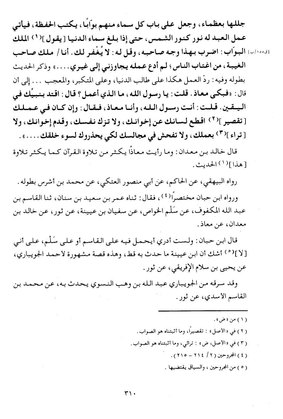 جللها بعظماء وَجعل على بَاب كل سَمَاء مِنْهُم بواباً يكْتب الْحفظَة فَيَأْتِي عمل العَبْد لَهُ نور كنوز الشَّمْس، حَتَّى إِذا بلغ سَمَاء الدُّنْيَا يَقُول الْملك البواب اضْرِب بِهَذَا وَجه صَاحبه وَقل لَهُ لَا يغْفر لَك أَنا ملك صَاحب الْغَيْبَة من اغتاب النَّاس لم أدع عمله يجاوزني إِلَى غَيْرِي ... " وَذكر الحَدِيث بِطُولِهِ وَفِيه: رد الْعَمَل هَكَذَا على طَالب الدُّنْيَا وعَلى المتكبر والمعجب إِلَى أَن قَالَ " فَبكى معَاذ قلت يَا رَسُول الله مَا الَّذِي أعمل قَالَ اقتد بنيتك فِي الْيَقِين قلت أَنْت رَسُول الله وَأَنا معَاذ فَقَالَ: وَإِن كَانَ فِي عَمَلك تَقْصِير اقْطَعْ لسَانك عَن إخوانك وَلَا تزك نَفسك وَقدم إخوانك وَلَا تراء بعملك وَلَا تفحش فِي مجلسك لكَي يحذروك لسوء خلقك ... " قَالَ خَالِد بن معدان: وَمَا رَأَيْت معَاذًا يكثر من تِلَاوَة الْقُرْآن كَمَا يكثر تِلَاوَة هَذَا الحَدِيث. رَوَاهُ الْبَيْهَقِيّ عَن الْحَاكِم عَن أبي مَنْصُور الْعَتكِي عَن مُحَمَّد بن أَشْرَس بِطُولِهِ وَرَوَاهُ ابْن حبَان مُخْتَصرا فَقَالَ: ثناه عمر بن سعيد بن سِنَان ثَنَا الْقَاسِم بن عبد الله المكفوف عَم سلم الْخَواص عَن سُفْيَان بن عُيَيْنَة عَن ثَوْر عَن خَالِد بن معدان عَن معَاذ قَالَ ابْن حبَان وَلست أَدْرِي أيحمل فِيهِ على الْقَاسِم أَن على سلم على أَنِّي لَا أَشك أَن ابْن عُيَيْنَة مَا حدث بِهِ قطّ وَهَذِه قصَّة مَشْهُورَة لِأَحْمَد الجويباري عَن يحيى بن سَلام الإفْرِيقِي، عَن ثَوْر. وَقد سَرقه من الجويباري عبد الْملك بن وهب النسوي يحدث بِهِ، عَن مُحَمَّد بن الْقَاسِم الْأَسدي عَن ثَوْر.