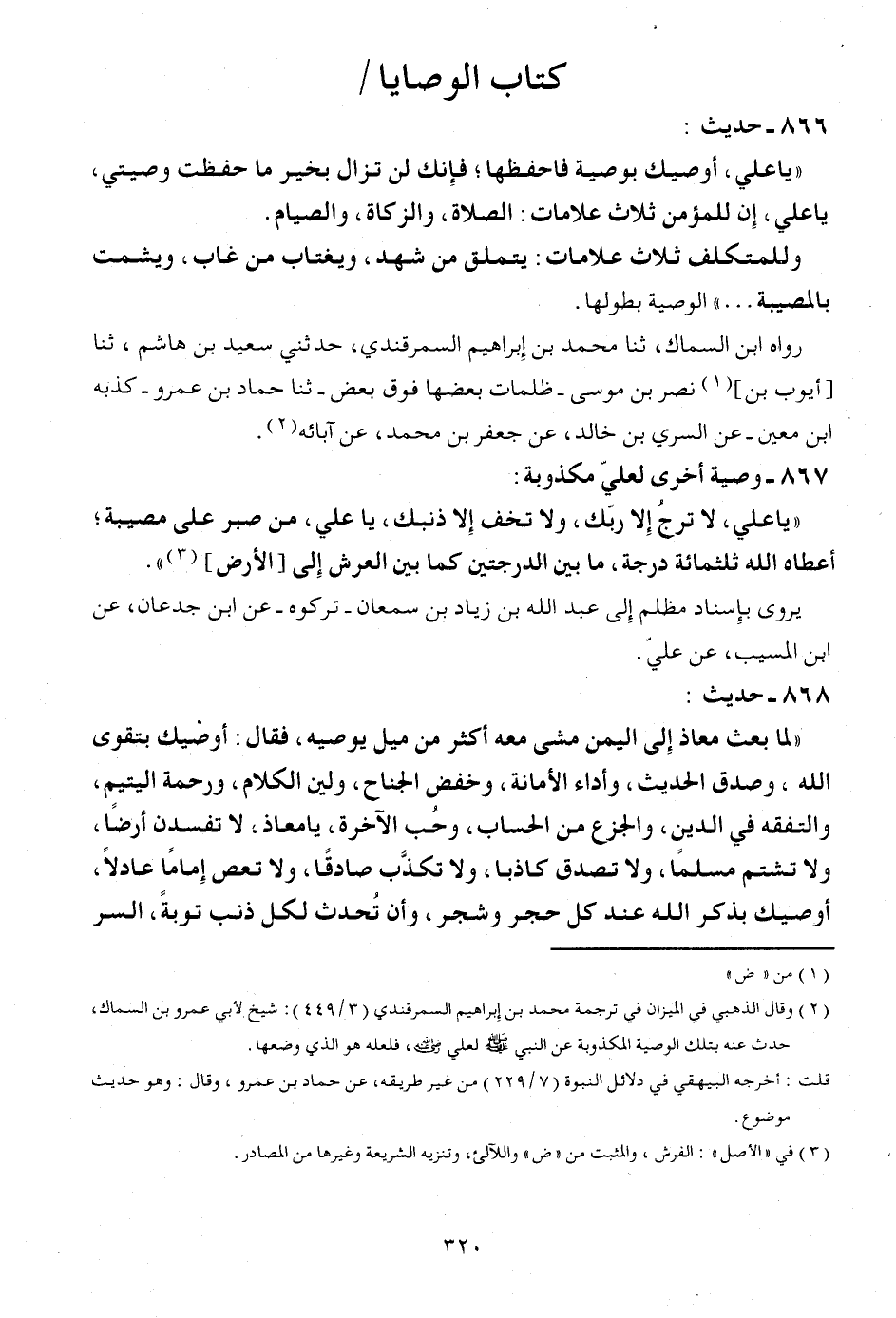867 - وَصِيَّة أُخْرَى لعَلي مكذوبة: " يَا عَليّ لَا ترج إِلَّا رَبك وَلَا تخف إِلَّا ذَنْبك ي عَليّ من صَبر على مُصِيبَة أعطَاهُ الله ثلثمِائة دَرَجَة مَا بَين الدرجتين كَمَا بَين الْعَرْش إِلَى الأَرْض " يرْوى بِإِسْنَادِهِ مظلم إِلَى عبد الله بن زِيَاد بن سمْعَان تَرَكُوهُ عَن ابْن جدعَان عَن ابْن الْمسيب عَن عَليّ.