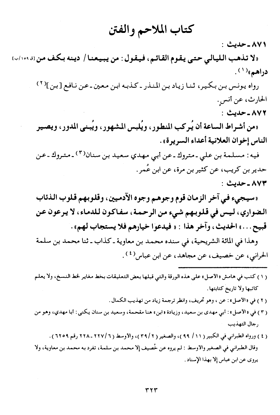 873 - " سجيء فِي آخر الزَّمَان قوم وجوهم وُجُوه الْآدَمِيّين، وَقُلُوبهمْ الذئاب الضواري لَيْسَ شَيْء من الرَّحْمَة سفاكون للدماء لَا يرعون عَن قَبِيح ... . " الحَدِيث وَآخر هَذَا " فيدعوا خياركم فَلَا يُسْتَجَاب لَهُم ". وَهَذَا فيالمائة الشريحة فِي سَنَده مُحَمَّد بن مُعَاوِيَة كَذَّاب ثَنَا مُحَمَّد بن سَلمَة الْحَرَّانِي عَن خصيف عَن مُجَاهِد عَن ابْن عَبَّاس.