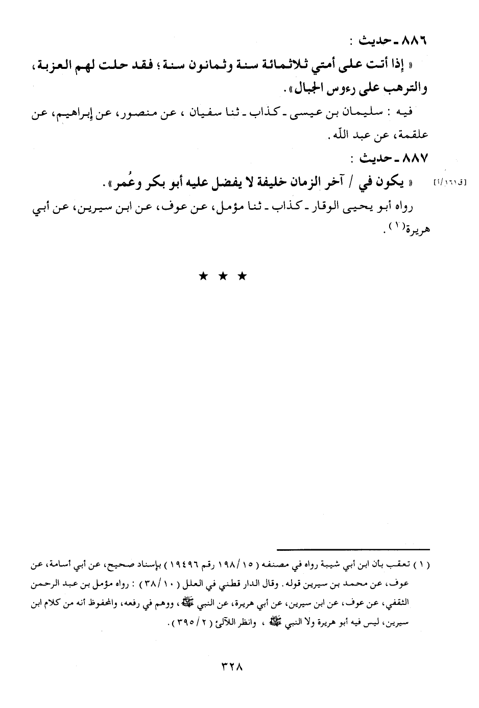 886 - حَدِيث " إِذا أَتَت على أمتِي ثَلَاثمِائَة سنة فقد حلت لَهُم الْعزبَة والتريب على رُءُوس الْجبَال ". فِيهِ سُلَيْمَان بن عِيسَى كَذَّاب ثَنَا سُفْيَان عَن مَنْصُور عَن إِبْرَاهِيم عَن عَلْقَمَة عَن عبد الله.