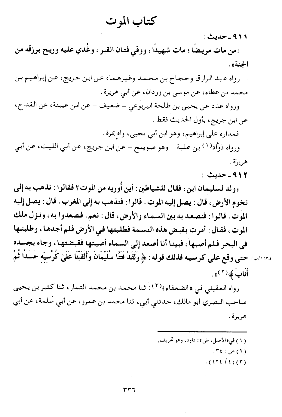 912 - حَدِيث " ولد لسيمان ابْن فَقَالَ للشياطين أَيْن أوريه من الْمَوْت فَقَالُوا نَذْهَب بِهِ إِلَى تخوم الأَرْض قَالَ يصل إِلَيْهِ الْمَوْت قَالُوا فنذهب بِهِ إِلَى الْمغرب قَالَ يصل إِلَيْهِ الْمَوْت قُولُوا فنصعد بِهِ بَين السَّمَاء وَالْأَرْض قَالَ نعم فَصَعِدُوا بِهِ وَنزل ملك الْمَوْت فَقَالَ أمرت بِقَبض هَذِه النَّسمَة فطلبتها فِي الأَرْض فَلم أَجدهَا وطلبتها فِي الْبَحْر فَلم أصبها فَبينا أَنا أصعد إِلَى السَّمَاء أصبتها فقبضتها وَجَاء بجسده حَتَّى وَقع على كرسيه فَذَلِك قَوْله {وَلَقَد فتنا سُلَيْمَان وألقينا على كرسيه جسدا ثمَّ أناب} رَوَاهُ الْعقيلِيّ فِي " الضُّعَفَاء " ثَنَا مُحَمَّد بن مُحَمَّد التمار ثَنَا كثير بن يحيى صَاحب الْبَصْرِيّ أَبُو مَالك حَدثنِي أبي ثَنَا مُحَمَّد بن عَمْرو عَن أبي سَلمَة عَن أبي هُرَيْرَة
