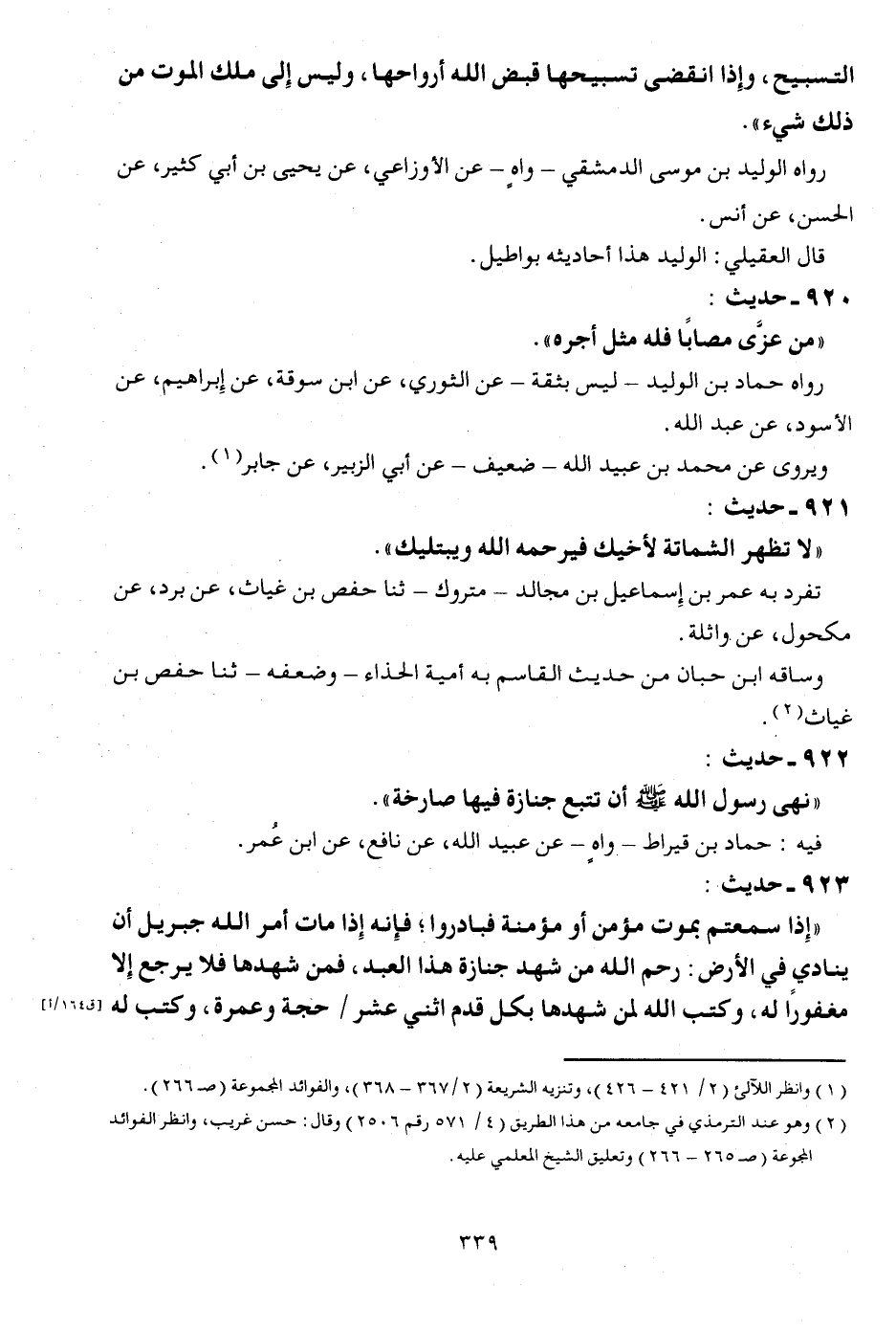 920 - حَدِيث: " من عزى مصابا فَلهُ مثل أجره ". رَوَاهُ حَمَّاد بن الْوَلِيد - لَيْسَ بِثِقَة - عَن الثَّوْريّ، عَن ابْن سوقة، عَن إِبْرَاهِيم، عَن الْأسود، عَن عبد الله. ويروى عَن مُحَمَّد بن عبيد الله - ضَعِيف - عَن أبي الزبير، عَن جَابر.