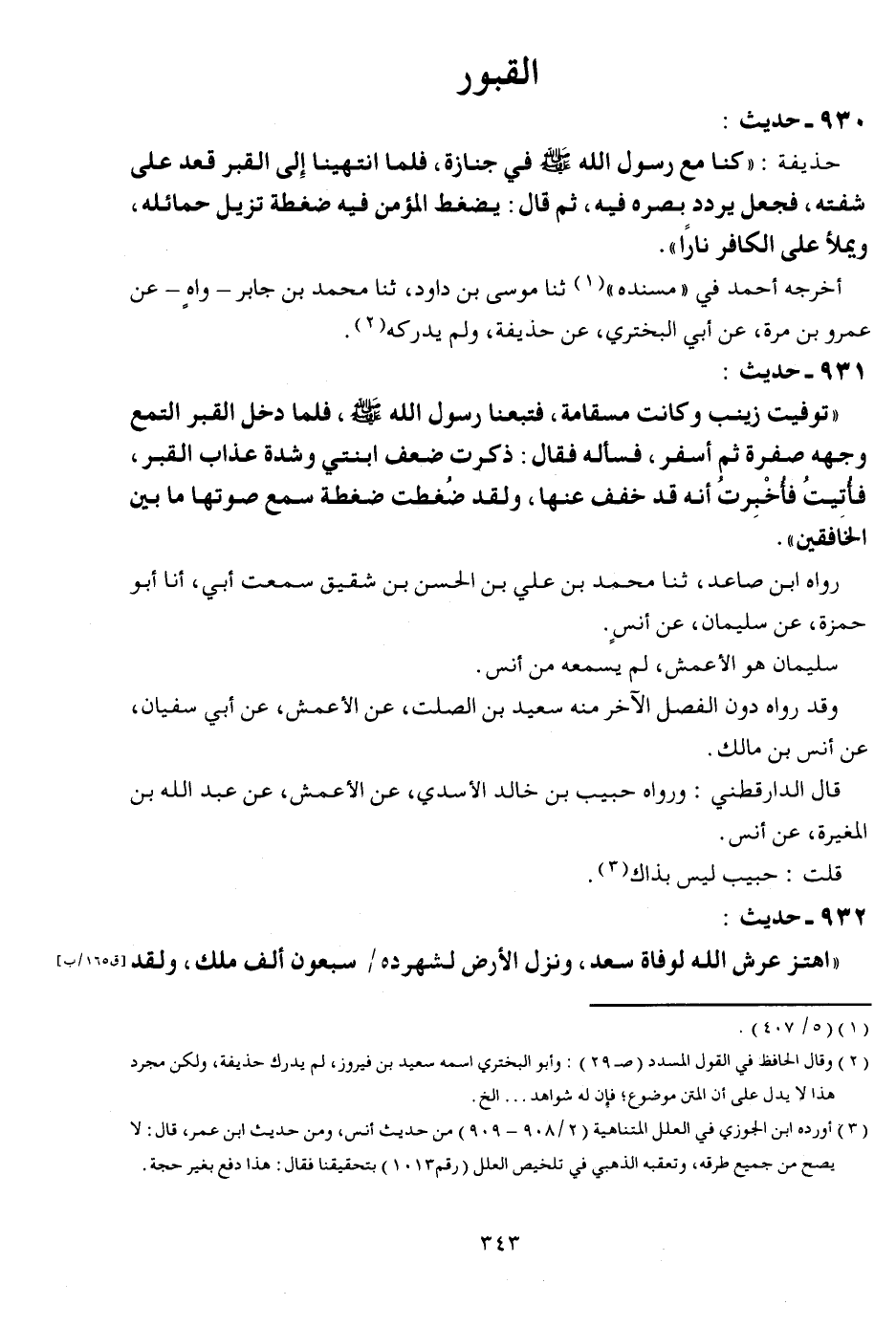 930 - حَدِيث: حُذَيْفَة: " كُنَّا مَعَ رَسُول الله صلى الله عَلَيْهِ وَسلم فِي جَنَازَة، فَلَمَّا انتهينا إِلَى الْقَبْر قعد على شفته، فَجعل يردد بَصَره فِيهِ، ثمَّ قَالَ: يضغط الْمُؤمن فِيهِ ضغطة تزيل حمائله، ويملأ على الْكَافِر نَارا ". أخرجه أَحْمد فِي " مُسْنده " ثَنَا مُوسَى بن دَاوُد، ثَنَا مُحَمَّد بن جَابر - واه - عَن عَمْرو بن مرّة، عَن أبي البخْترِي، عَن حُذَيْفَة، وَلم يُدْرِكهُ.
