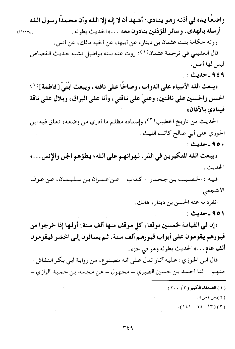 949 - حَدِيث: " يبْعَث الله الْأَنْبِيَاء على الدَّوَابّ، وصالحا على نَاقَته، وَيبْعَث ابْني [فَاطِمَة] الْحسن وَالْحُسَيْن على ناقتين، وَعلي على نَاقَتي، وَأَنا على الْبراق، وبلال على نَاقَة فينادي بِالْأَذَانِ ". الحَدِيث من تَارِيخ الْخَطِيب، وَإِسْنَاده مظلم مَا أَدْرِي من وَضعه، تعلق فِيهِ ابْن الْجَوْزِيّ على أبي صَالح كَاتب اللَّيْث.