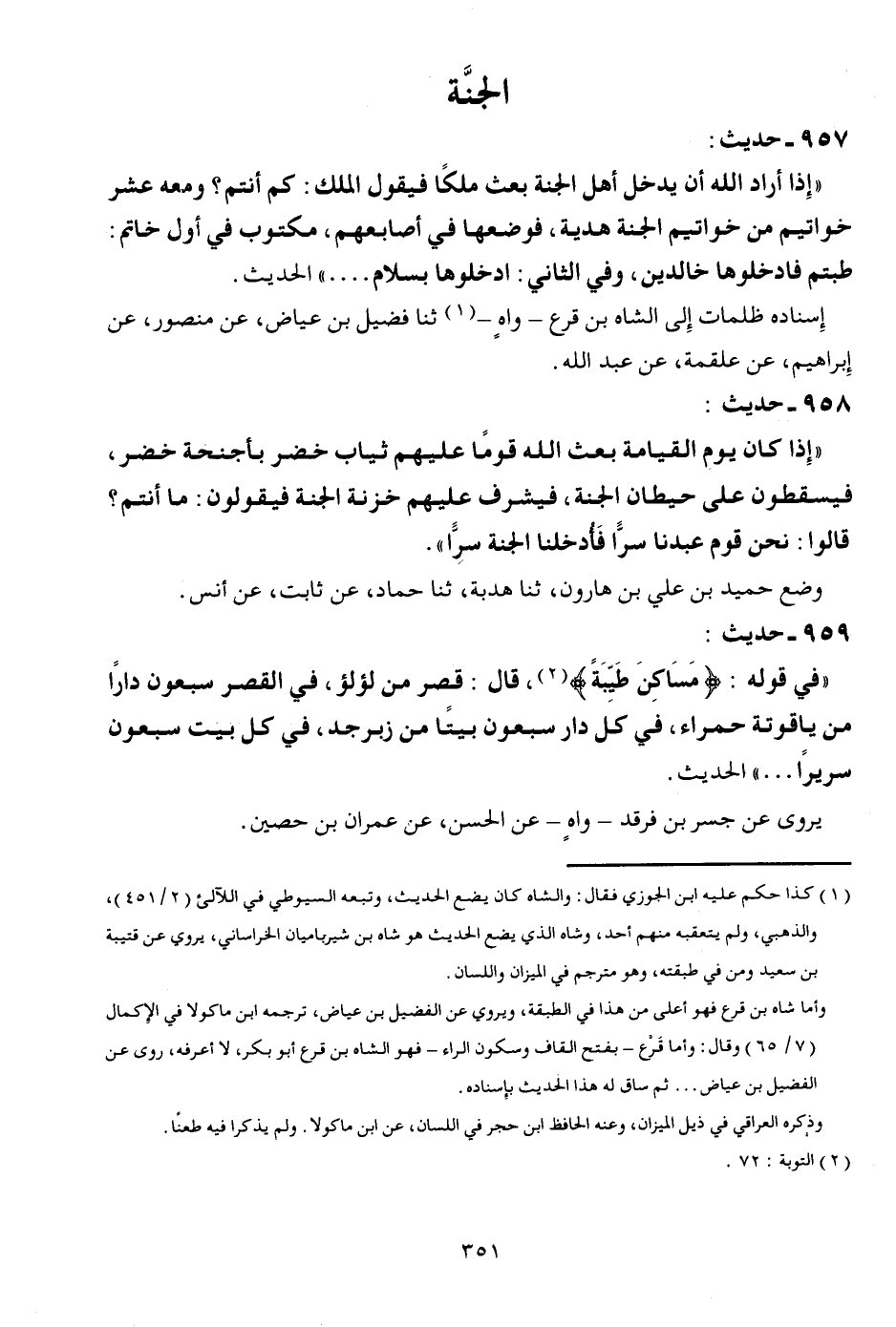 959 - حَدِيث: " فِي قَوْله: {مسَاكِن طيبَة} ، قَالَ: قصر من لُؤْلُؤ، فِي الْقصر سَبْعُونَ دَارا من ياقوتة حَمْرَاء، فِي كل دَار سَبْعُونَ بَيْتا من زبرجد، فِي كل بَيت سَبْعُونَ سريرا ... " الحَدِيث. يرْوى عَن جسر بن فرقد - واه - عَن الْحسن، عَن عمرَان بن حُصَيْن.