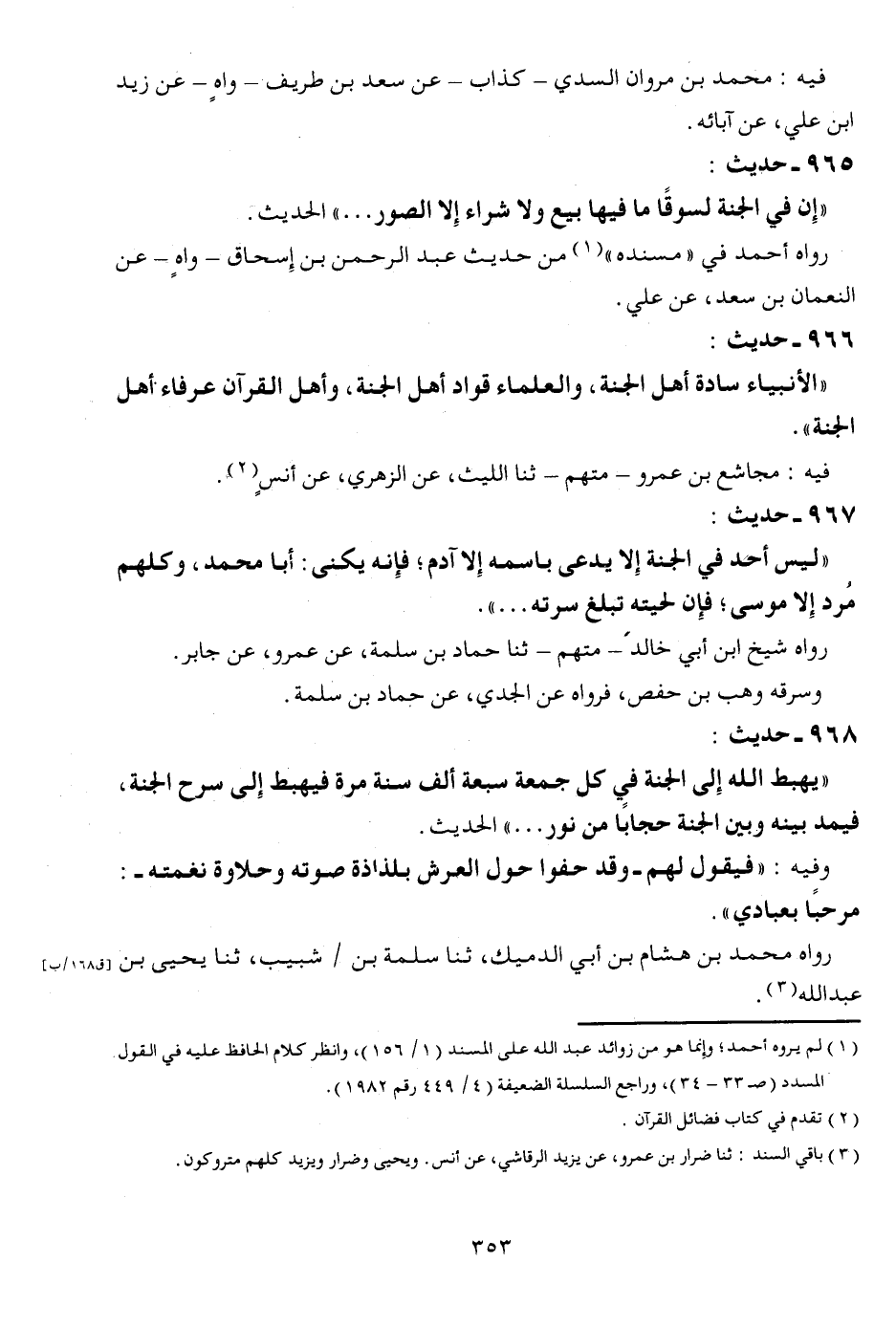 965 - حَدِيث: " إِن فِي الْجنَّة لسوقا مَا فِيهَا بيع وَلَا شِرَاء إِلَّا الصُّور ... " الحَدِيث. رَوَاهُ أَحْمد فِي " مُسْنده " من حَدِيث عبد الرَّحْمَن بن إِسْحَاق - واه - عَن النُّعْمَان بن سعد، عَن عَليّ.