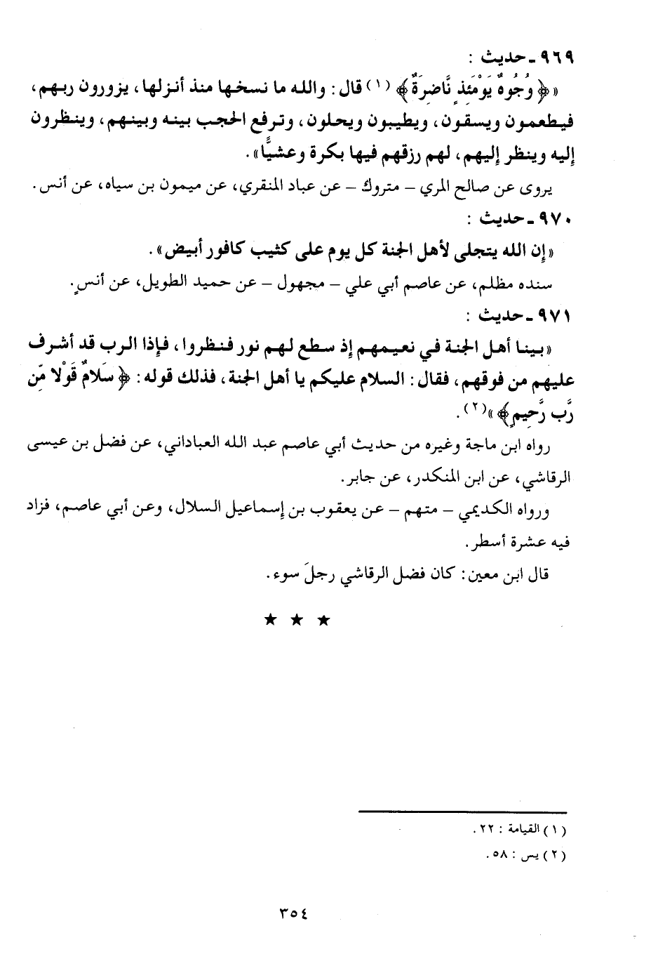 969 - حَدِيث: " {وُجُوه يَوْمئِذٍ ناضرة} قَالَ: مَا نسخهَا مُنْذُ أنزلهَا، يزورون رَبهم، فيطعمون ويسقون، ويطيبون وَيحلونَ، وترفع الْحجب بَينه وَبينهمْ، وَيَنْظُرُونَ إِلَيْهِ وَينظر إِلَيْهِم، لَهُم رزقهم فِيهَا بكرَة وعشيا ". يرْوى عَن صَالح المري - مَتْرُوك - عَن عباد الْمنْقري، عَن مَيْمُون بن سياه، عَن أنس.