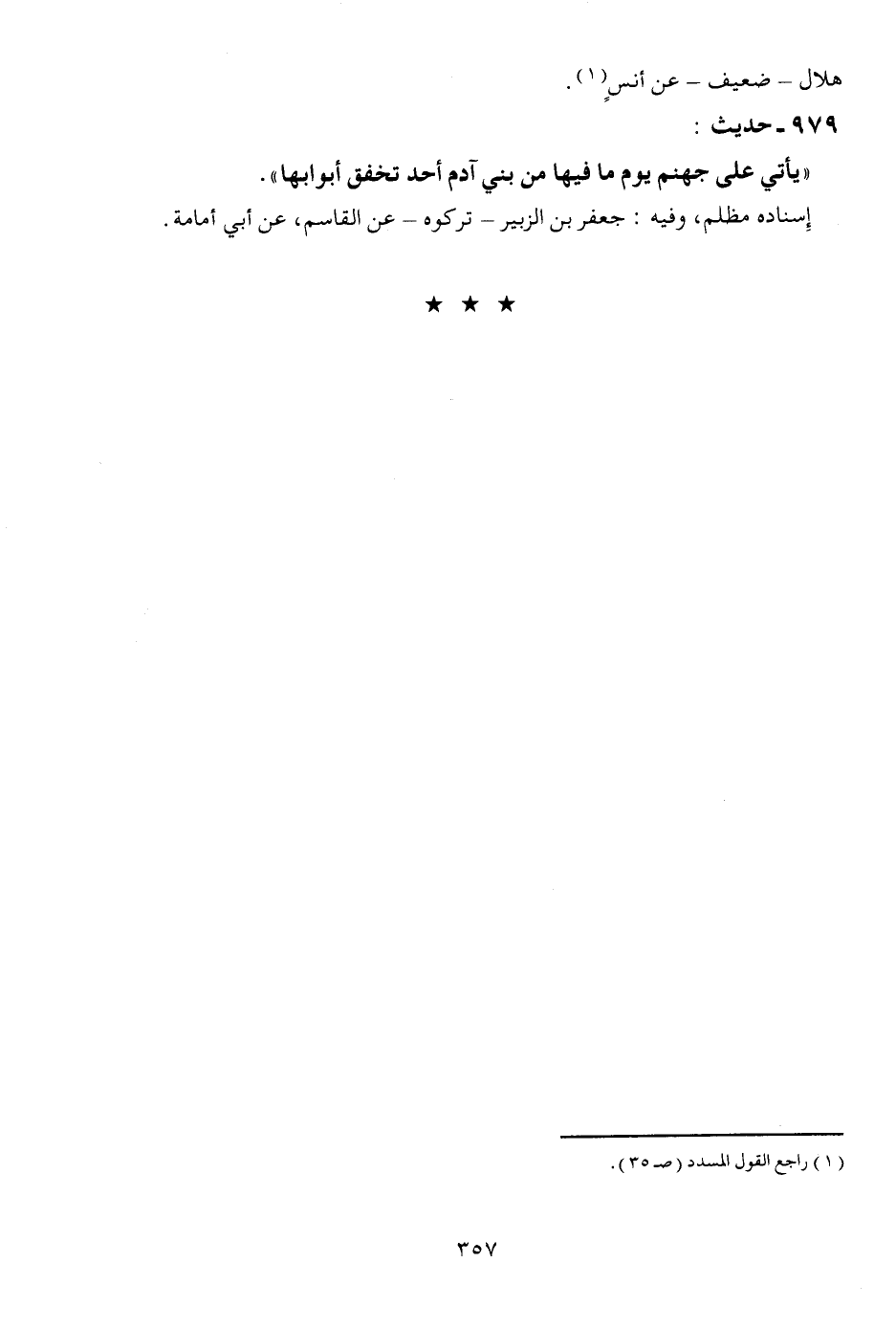 979 - حَدِيث: " يَأْتِي على جَهَنَّم يَوْم مَا فِيهَا من بني آدم أحد تخفق أَبْوَابهَا ". إِسْنَاده مظلم، وَفِيه: جَعْفَر بن الزبير - تَرَكُوهُ - عَن الْقَاسِم، عَن أبي أُمَامَة.