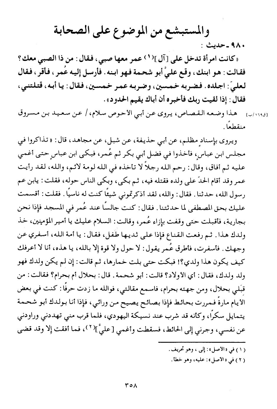 980 - حَدِيث: " كَانَت امْرَأَة تدخل على [آل] عمر مَعهَا صبي، فَقَالَ: من ذَا الصَّبِي مَعَك؟ فَقَالَت: هُوَ ابْنك، وَقع عَليّ أَبُو شحمة فَهُوَ ابْنه. فَأرْسل إِلَيْهِ عمر، فاقر، فَقَالَ لعَلي: اجلده. فَضَربهُ خمسين، وضربه عمر خمسين، فَقَالَ: يَا أبه، قتلتني، فَقَالَ: إِذا لقِيت رَبك فَأخْبرهُ أَن أَبَاك يُقيم الْحُدُود ". هَذَا وَضعه الْقصاص، يرْوى عَن أبي الْأَحْوَص سَلام، / عَن سعيد بن مَسْرُوق مُنْقَطِعًا. ويروى بِإِسْنَاد مظلم، عَن أبي حُذَيْفَة، عَن شبْل، عَن مُجَاهِد، قَالَ: " تَذَاكَرُوا فِي مجْلِس ابْن عَبَّاس، فَأخذُوا فِي فضل أبي بكر ثمَّ عمر، فَبكى ابْن عَبَّاس حَتَّى أُغمي عَلَيْهِ ثمَّ أَفَاق، وَقَالَ: رحم الله رجلا لَا تَأْخُذهُ فِي الله لومة لائم، وَالله، لقد رَأَيْت عمر وَقد اقام الْحَد على وَلَده فَقتله فِيهِ، ثمَّ بَكَى، وَبكى النَّاس حوله، فَقلت: يَا ابْن عَم رَسُول الله، حَدثنَا. فَقَالَ: وَالله، لقد أذكرتموني شَيْئا كنت لَهُ نَاسِيا. فَقلت: أَقْسَمت عَلَيْك بِحَق الْمُصْطَفى لما حَدَّثتنَا. فَقَالَ: كنت جَالِسا عِنْد عمر فِي الْمَسْجِد فَإِذا نَحن بِجَارِيَة، فَأَقْبَلت حَتَّى وقفت بِإِزَاءِ عمر، وَقَالَ: السَّلَام عَلَيْك يَا أَمِير الْمُؤمنِينَ، خُذ ولدك هَذَا. ثمَّ رفعت القناع فَإِذا على ثديها طِفْل، فَقَالَ: يَا أمة الله، أسفري عَن وَجهك. فأسفرت، فَأَطْرَقَ عمر يَقُول: لَا حول وَلَا قُوَّة إِلَّا بِاللَّه، يَا هَذِه، أَنا لَا أعرفك كَيفَ يكون هَذَا وَلَدي؟ ! فَبَكَتْ حَتَّى بلت خمارها، ثمَّ قَالَت: إِن لم يكن ولدك فَهُوَ ولد ولدك، فَقَالَ: أَي الْأَوْلَاد؟ قَالَت أَبُو شحمة. قَالَ: بحلال أم بِحرَام؟ فَقَالَت: من قبلي بحلال، وَمن جِهَته بِحرَام، فاسمع مَقَالَتي، فوَاللَّه مَا زِدْت حرفا: كنت فِي بعض الْأَيَّام مارة فمررت بحائط فَإِذا بصائح يَصِيح من ورائي، فَإِذا أَنا بولدك أَبُو شحمة يتمايل سكرا، وَكَأَنَّهُ قد شرب عِنْد نسيكة الْيَهُودِيّ، فَلَمَّا قرب مني تهدنني وراودني عَن نَفسِي، وجرني إِلَى الْحَائِط، فَسَقَطت وأغمي [عَليّ] ، فَمَا أَفَقْت إِلَّا وَقد قضى