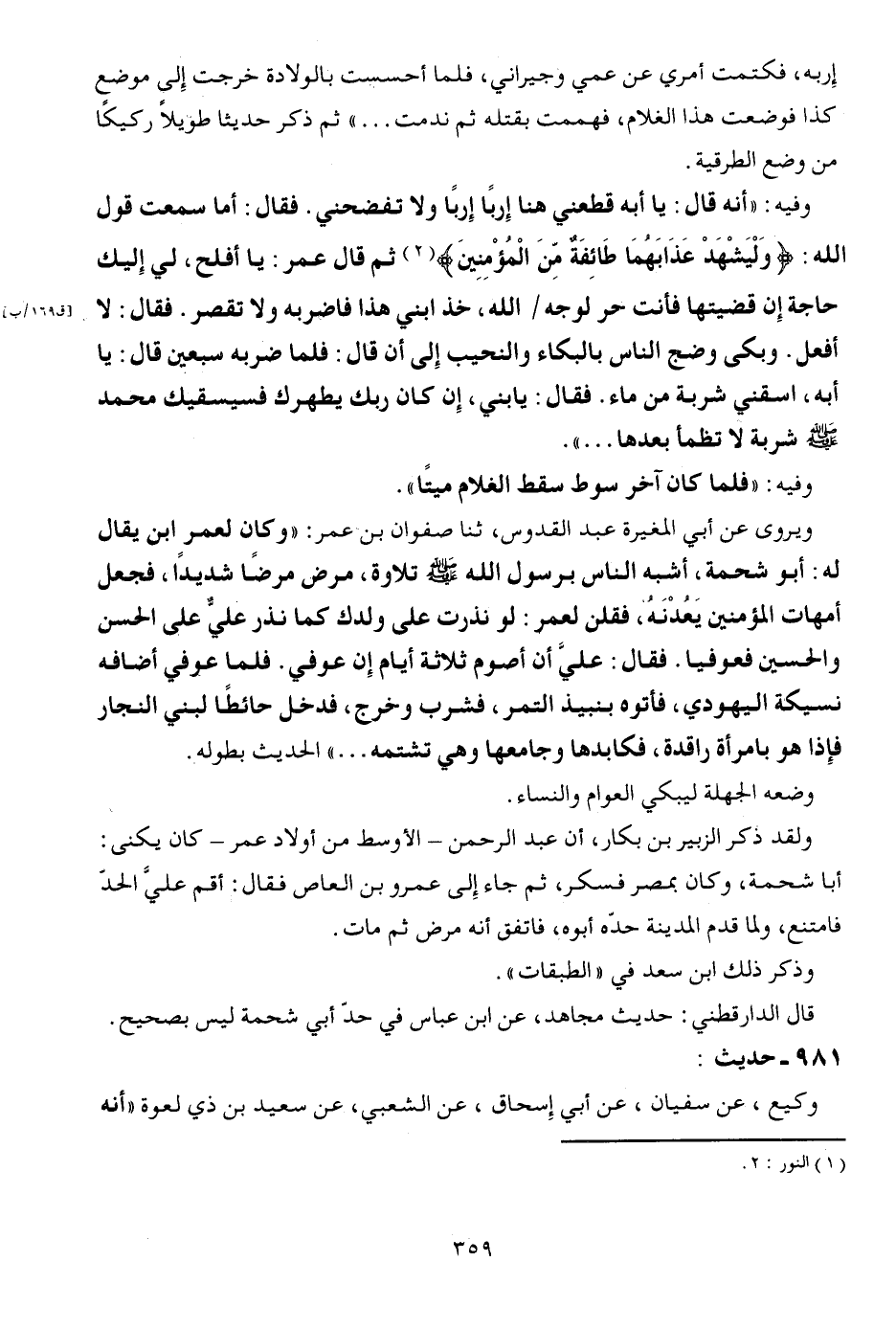 إربه، فكتمت أَمْرِي عَن عمي وجيراني، فَلَمَّا أحسست بِالْولادَةِ خرجت إِلَى مَوضِع كَذَا فَوضعت هَذَا الْغُلَام، فهممت بقتْله ثمَّ نَدِمت ... " ثمَّ ذكر حَدِيثا طَويلا ركيكا من وضع الطرقية. وَفِيه: " أَنه قَالَ: يَا أبه قطعني هُنَا أربا أربا وَلَا تفضحني. فَقَالَ: أما سَمِعت قَول الله: {وليشهد عذابهما طَائِفَة من الْمُؤمنِينَ} ثمَّ قَالَ عمر: يَا أَفْلح، لي إِلَيْك حَاجَة إِن قضيتها فَأَنت حر لوجه / الله، خُذ ابْني هَذَا فَاضْرِبْهُ وَلَا تقصر. فَقَالَ: لَا أفعل. وَبكى وضج النَّاس بالبكاء والنحيب إِلَى أَن قَالَ: فَلَمَّا ضربه سبعين قَالَ: يَا أبه، اسْقِنِي شربة من مَاء. فَقَالَ: يَا بني، إِن كَانَ رَبك يطهرك فسيسقيك مُحَمَّد صلى الله عَلَيْهِ وَسلم شربة لَا تظمأ بعْدهَا ... ". وَفِيه: " فَلَمَّا كَانَ آخر سَوط سقط الْغُلَام مَيتا ". ويروى عَن أبي الْمُغيرَة عبد القدوس، ثَنَا صَفْوَان بن عمر: " وَكَانَ لعمر ابْن يُقَال لَهُ: أَبُو شحمة، أشبه النَّاس برَسُول الله صلى الله عَلَيْهِ وَسلم تِلَاوَة، مرض مَرضا شَدِيدا، فَجعل أُمَّهَات الْمُؤمنِينَ يعدنه، فَقُلْنَ لعمر: لَو نذرت على ولدك كَمَا نذر عَليّ على الْحسن وَالْحُسَيْن فعوفيا. فَقَالَ: عَليّ أَن أَصوم ثَلَاثَة أَيَّام إِن عوفي. فَلَمَّا عوفي أَضَافَهُ نسيكة الْيَهُودِيّ، فَأتوهُ بنبيذ التَّمْر، فشؤب وَخرج، فَدخل حَائِطا لبني النجار فَإِذا هُوَ بِامْرَأَة رَاقِدَة، فكابدها وجامعها وَهِي تشتمه ... " الحَدِيث بِطُولِهِ. وَضعه الجهلة ليبكي الْعَوام وَالنِّسَاء. وَلَقَد ذكر الزبير بن بكار، أَن عبد الرَّحْمَن - الْأَوْسَط من أَوْلَاد عمر - كَانَ يكنى: أَبَا شحمة، وَكَانَ بِمصْر فَسَكِرَ، ثمَّ جَاءَ إِلَى عَمْرو بن الْعَاصِ فَقَالَ: أقِم عَليّ الْحَد فَامْتنعَ، وَلما قدم الْمَدِينَة حَده أَبوهُ، فاتفق أَنه مرض ثمَّ مَاتَ. وَذكر ذَلِك ابْن سعد فِي " الطَّبَقَات ". قَالَ الدَّارَقُطْنِيّ: حَدِيث مُجَاهِد، عَن ابْن عَبَّاس فِي حد أبي شحمة لَيْسَ بِصَحِيح. 981 - حَدِيث: وَكِيع، عَن سُفْيَان، عَن أبي إِسْحَاق، عَن الشّعبِيّ، عَن سعيد بن ذِي لعوة " أَنه