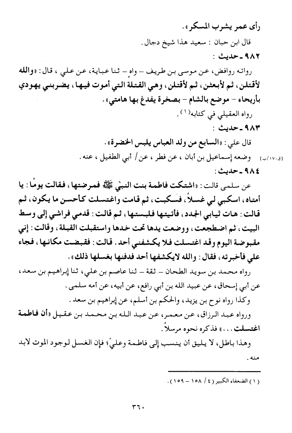 984 - حَدِيث: عَن سلمى قَالَت: " اشتكت فَاطِمَة بنت النَّبِي صلى الله عَلَيْهِ وَسلم فمرضتها، فَقَالَت يَوْمًا: يَا أمتاه، اسكبي لي غسلا، فَسَكَبت، ثمَّ قَامَت وَاغْتَسَلت كأحسن مَا يكون، ثمَّ قَالَت: هَات ثِيَابِي الجدد، فأتيتها فلبستها، ثمَّ قَالَت: قدمي فِرَاشِي إِلَى وسط الْبَيْت، ثمَّ اضطجعت، وَوضعت يَدهَا تَحت خدها واستقبلت الْقبْلَة، وَقَالَت: إِنِّي مَقْبُوضَة الْيَوْم وَقد اغتلست فَلَا يكشفني أحد. قَالَت: فقبضت مَكَانهَا، فجَاء عَليّ فَأَخْبَرته، فَقَالَ: وَالله لَا يكشفها أحد فدفنها بغسلها ذَلِك ". رَوَاهُ مُحَمَّد بن سُوَيْد الطَّحَّان - ثِقَة - ثَنَا عَاصِم بن عَليّ، ثَنَا إِبْرَاهِيم بن سعد، عَن أبي إِسْحَاق، عَن عبيد الله بن أبي رَافع، عَن أَبِيه، عَن أمه سلمى. وَكَذَا رَوَاهُ نوح بن يزِيد، وَالْحكم بن أسلم، عَن إِبْرَاهِيم بن سعد. وَرَوَاهُ عبد الرَّزَّاق، عَن معمر، عَن عبد الله بن مُحَمَّد بن عقيل " أَن فَاطِمَة اغْتَسَلت ... " فَذكره نَحوه مُرْسلا. وَهَذَا بَاطِل، لَا يَلِيق أَن ينْسب إِلَى فَاطِمَة وَعلي؛ فَإِن الْغسْل لوُجُود الْمَوْت لَا بُد مِنْهُ.