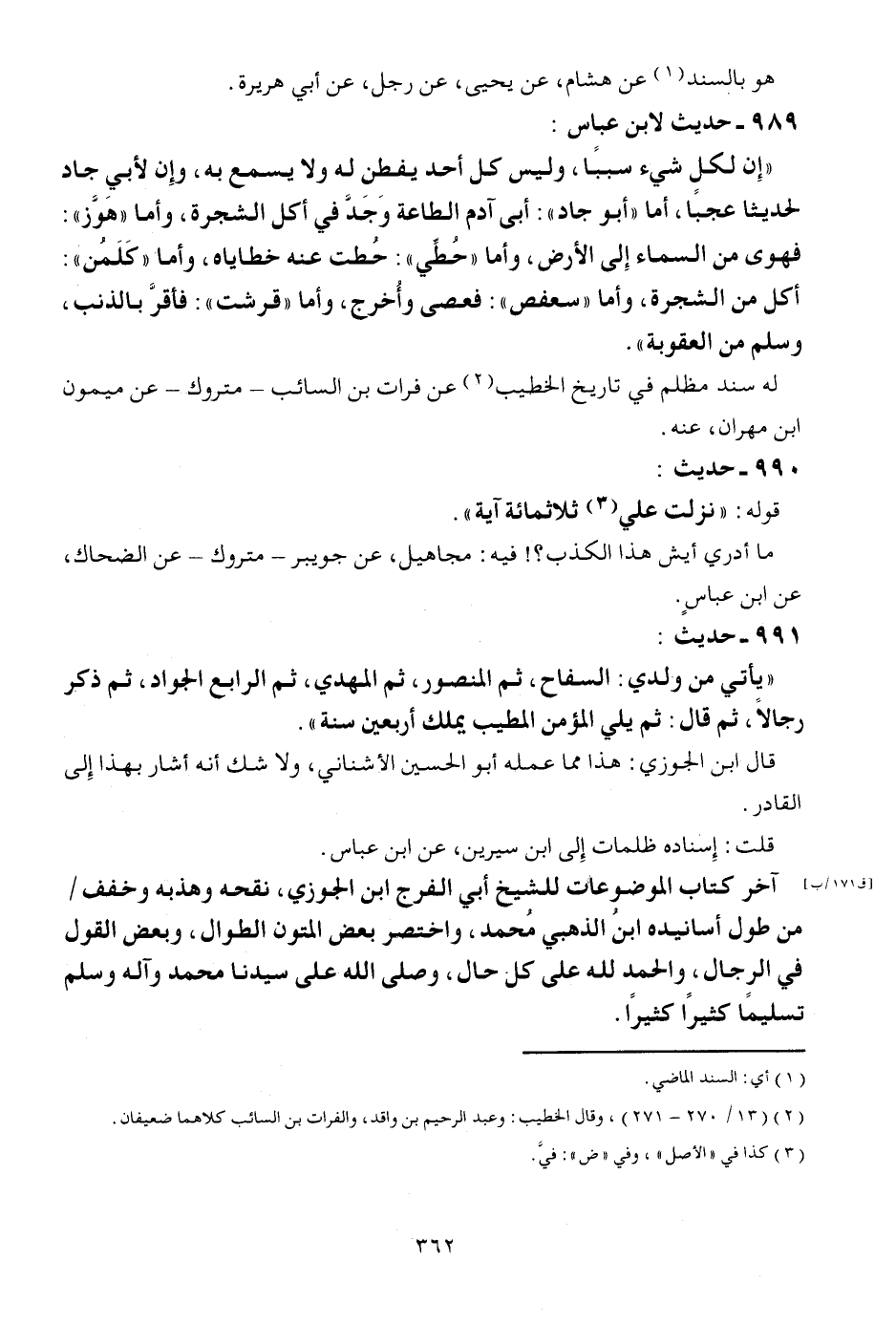 989 - حَدِيث لِابْنِ عَبَّاس: " إِن لكل شَيْء شببا، وَلَيْسَ كل أحد يفْطن لَهُ وَلَا يسمع بِهِ، وَإِن لأبي جاد لحديثا عجبا، أما " أَبُو جاد ": أبي آدم الطَّاعَة وجد فِي أكل الشَّجَرَة، وَأما " هوز ": فهوى من السَّمَاء إِلَى الأَرْض، وَأما " حطي ": حطت عَنهُ خطاياه، وَأما " كلمن ": أكل من الشَّجَرَة، وَأما " سعفص ": فعصى وَأخرج، وَأما " قرشت ": فَأقر بالذنب، وَسلم من الْعقُوبَة ". لَهُ سَنَد مظلم فِي تَارِيخ الْخَطِيب عَن فرات بن السَّائِب - مَتْرُوك - عَن مَيْمُون ابْن مهْرَان، عَنهُ.