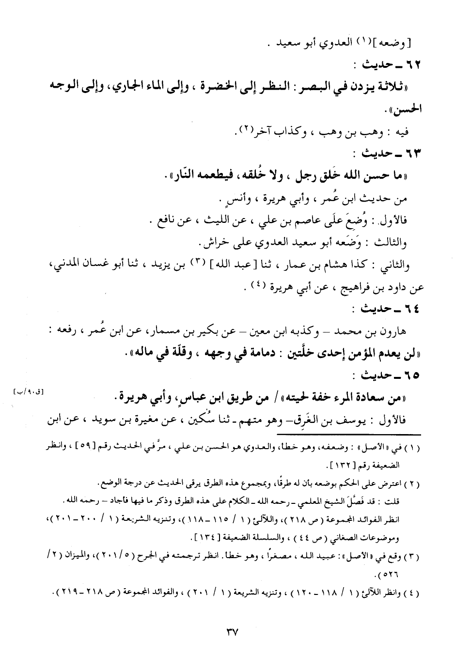 63 - حَدِيث: " مَا حسن الله خلق رجل، وَلَا خلقه، فيطعمه النَّار ". من حَدِيث ابْن عمر، وَأبي هُرَيْرَة، وَأنس. فَالْأول: وضع على عَاصِم بن عَليّ، عَن اللَّيْث، عَن نَافِع. وَالثَّالِث: وَضعه أَبُو سعيد الْعَدوي على خرَاش. وَالثَّانِي: كَذَا هِشَام بن عمار، ثَنَا [عبد الله] بن يزِيد، ثَنَا أَبُو غَسَّان الْمدنِي، عَن دَاوُد بن فَرَاهِيجَ، عَن أبي هُرَيْرَة.