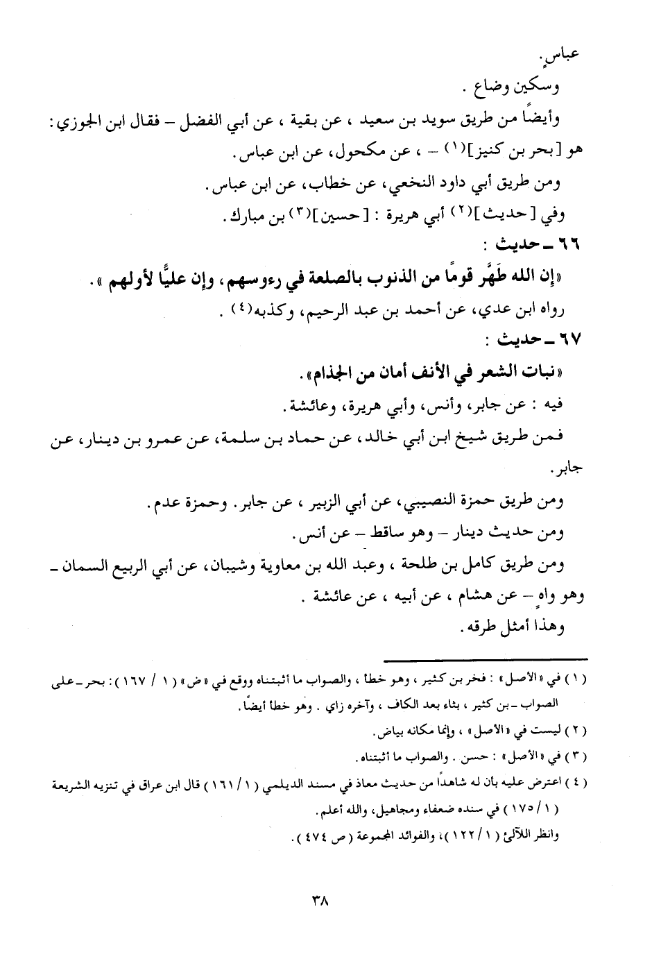 67 - حَدِيث: " نَبَات الشّعْر فِي الْأنف أَمَام من الجذام ". فِيهِ: عَن جَابر، وَأنس، وَأبي هُرَيْرَة، وَعَائِشَة. فَمن طَرِيق شيخ ابْن أبي خَالِد، عَن حَمَّاد بن سَلمَة، عَن عَمْرو بن دِينَار، عَن جَابر. وَمن طَرِيق حَمْزَة النصيبي، عَن أبي الزبير، عَن جَابر. وَحَمْزَة عدم. وَمن حَدِيث دِينَار - وَهُوَ سَاقِط - عَن أنس. وَمن طَرِيق كَامِل بن طَلْحَة، وَعبد الله بن مُعَاوِيَة وشيبان، عَن أبي الرّبيع السمان وَهُوَ واهٍ - عَن هِشَام، عَن أَبِيه، عَن عَائِشَة. وَهَذَا أمثل طرقه.