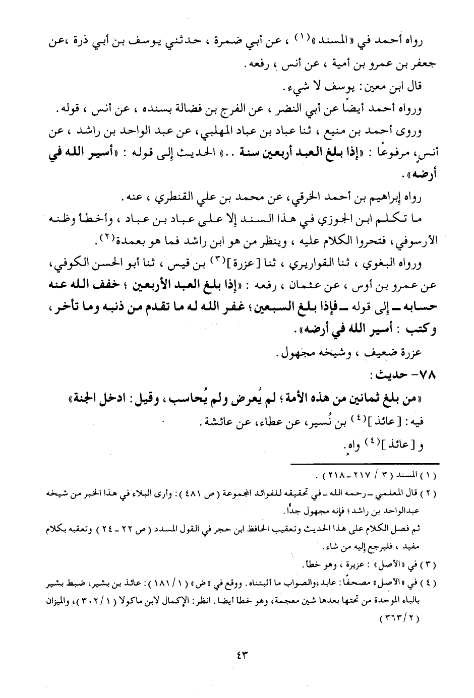 رَوَاهُ أَحْمد فِي " الْمسند "، عَن أبي ضَمرَة، حَدثنِي يُوسُف بن أبي ذرة، عَن جَعْفَر بن عَمْرو بن أُميَّة، عَن أنس، رَفعه. قَالَ ابْن معِين: يُوسُف لَا شَيْء. وَرَوَاهُ أَحْمد أَيْضا عَن أبي النَّضر، عَن الْفرج بن فضَالة بِسَنَدِهِ، عَن أنس، قَوْله. وروى أَحْمد بن منيع، ثَنَا عباد بن عباد المهلبي، عَن عبد الْوَاحِد بن رَاشد، عَن أنس مَرْفُوعا: " إِذا بلغ العَبْد أَرْبَعِينَ سنة ... " الحَدِيث إِلَى قَوْله: " أَسِير الله فِي أرضه ". رَوَاهُ إِبْرَاهِيم بن أَحْمد الْخرقِيّ، عَن مُحَمَّد بن عَليّ الْقَنْطَرِي، عَنهُ. مَا تكلم ابْن الْجَوْزِيّ فِي هَذَا السَّنَد إِلَّا على عباد بن عباد، وَأَخْطَأ وظنه الأرسوفي، فتحروا الْكَلَام عَلَيْهِ، وَينظر من هُوَ ابْن رَاشد فَمَا هُوَ بعمدة. وَرَوَاهُ الْبَغَوِيّ، ثَنَا القواريري، ثَنَا [عزْرَة] بن قيس، ثَنَا أَبُو الْحسن الْكُوفِي، عَن عَمْرو بن أَوْس، عَن عُثْمَان، رَفعه: " إِذا بلغ العَبْد الْأَرْبَعين؛ خفف الله عَنهُ حسابه - إِلَى قَوْله - فَإِذا بلغ السّبْعين؛ غفر الله لَهُ مَا تقدم من ذَنبه وَمَا تَأَخّر، وَكتب: أَسِير فِي أرضه ". عزْرَة ضَعِيف، وَشَيْخه مَجْهُول.