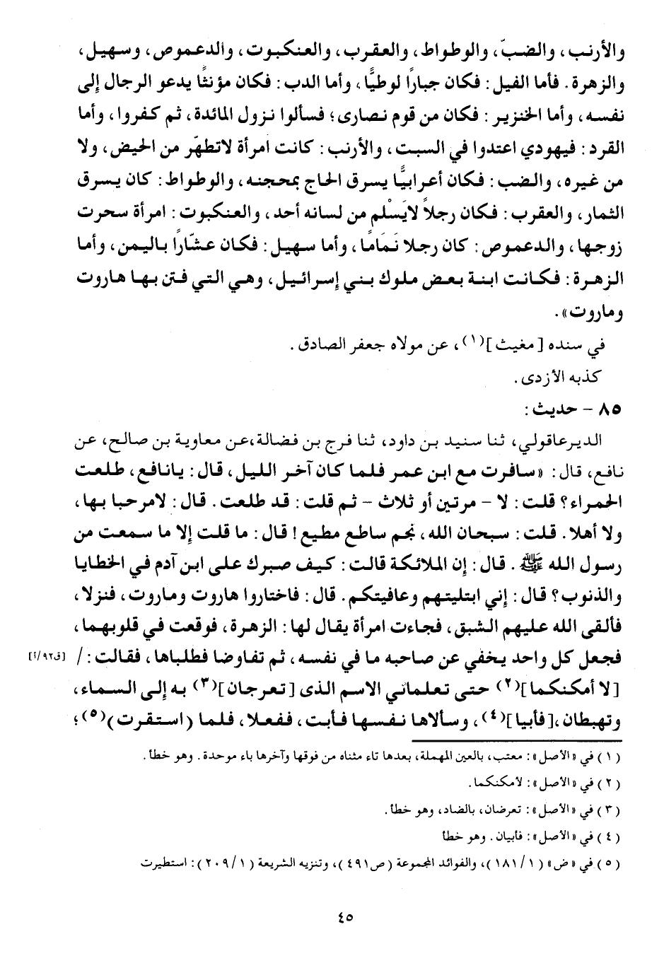 والأرنب، والضب، والوطواط، وَالْعَقْرَب، وَالْعَنْكَبُوت، والدعموص، وَسُهيْل، والزهرة. فَأَما الْفِيل: فَكَانَ جباراً لوطياً، وَأما الدب: فَكَانَ مؤنثاً يَدْعُو الرِّجَال إِلَى نَفسه، وَأما الْخِنْزِير: فمان من قوم النَّصَارَى؛ فسألوا نزُول الْمَائِدَة، ثمَّ كفرُوا، وَأما القرد: فيهودي اعتدوا فِي السبت، والأرنب: كَانَت امْرَأَة لَا تطهر من الْحيض، وَلَا من غَيره، والضب: فَكَانَ أَعْرَابِيًا يسرق الْحَاج بِمِحْجَنِهِ، والوطواط: كَانَ يسرق الثِّمَار، وَالْعَقْرَب: فَكَانَ رجلا لَا يسلم من لِسَانه أحد، وَالْعَنْكَبُوت: امْرَأَة سحرت زَوجهَا، والدعموص: كَانَ رجلا نماماً، وَأما سُهَيْل: فَكَانَ عشاراً بِالْيَمِينِ، وَأما الزهرة: فَكَانَت ابْنة بعض مُلُوك بني إِسْرَائِيل وَهِي الَّتِي فتن بهَا هاروت وماروت ". فِي سَنَده [مغيث] ، عَن مَوْلَاهُ جَعْفَر الصَّادِق. كذبه الأزدى.