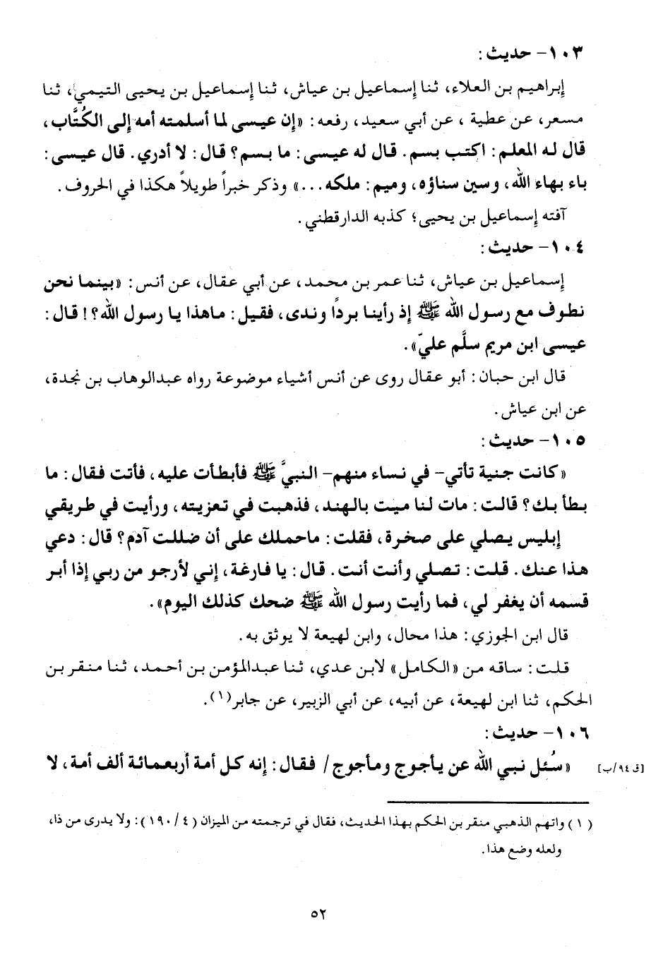 104 - حَدِيث: إِسْمَاعِيل بن عَيَّاش، ثَنَا عمر بن مُحَمَّد، عَن أبي عقال، عَن أنس: " بَيْنَمَا نَحن نظرف مَعَ رَسُول الله صلى الله عَلَيْهِ وَسلم إِذْ رَأينَا بردا وندى، فَقيل: مَا هَذَا يَا رَسُول الله؟ قَالَ: عِيسَى ابْن مَرْيَم سلم عَليّ ". قَالَ ابْن جبان: أَبُو عقال روى عَن أنس أَشْيَاء مَوْضُوعَة رَوَاهُ عبد الْوَهَّاب بن نجدة، عَن ابْن عَيَّاش.