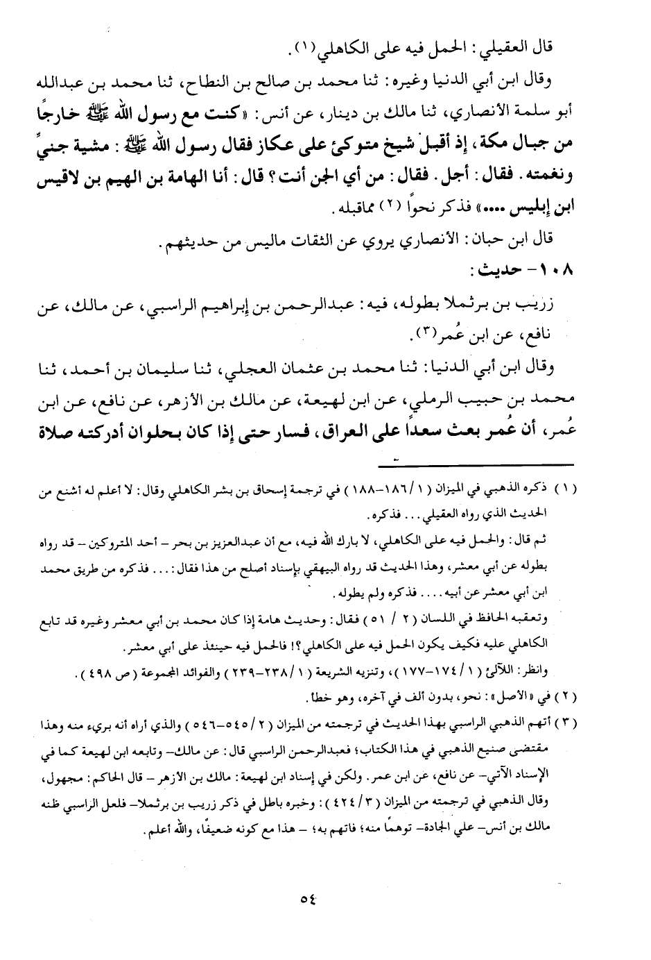 قَالَ الْعقيلِيّ: الْحمل فِيهِ على الْكَاهِلِي. وَقَالَ ابْن أبي الدُّنْيَا وَغَيره: ثَنَا مُحَمَّد بن صَالح بن النطاح، ثَنَا مُحَمَّد بن عبد الله أَبُو سَلمَة الْأنْصَارِيّ، ثَنَا مَالك بن دِينَار، عَن أنس: " كنت مَعَ رَسُول الله صلى الله عَلَيْهِ وَسلم خَارِجا من جبال مَكَّة، إِذْ أقبل شيخ متوكئ على عكاز فَقَالَ رَسُول الله صلى الله عَلَيْهِ وَسلم: مشْيَة جني ونغمته. فَقَالَ: أجل. فَقَالَ: من أَي الْجِنّ أَنْت؟ قَالَ: أَنا الهامة بن الهيم بن لاقيس ابْن إِبْلِيس ... " فَذكر نَحوا مِمَّا قبله. قَالَ ابْن حبَان: الْأنْصَارِيّ يروي عَن الثِّقَات مَا لَيْسَ من حَدِيثهمْ.