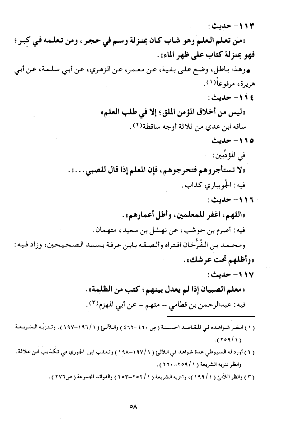 116 - حَدِيث: " اللَّهُمَّ، اغْفِر للمعلمين، وأطل أعمارهم ". فِيهِ: أَصْرَم بن حَوْشَب، عَن نهشل بن سعيد، متهمان. وَمُحَمّد بن الفرخان افتراه وألصقه بِابْن عَرَفَة بِسَنَد الصَّحِيحَيْنِ، وَزَاد فِيهِ: " وأظلهم تَحت عرشك ".