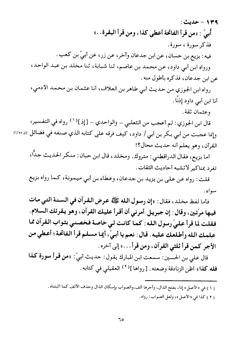 139 - حَدِيث: أُبيّ: " من قَرَأَ الْفَاتِحَة أعْطى كَذَا، وَمن قَرَأَ الْبَقَرَة ... ". فَذكر سُورَة، سُورَة. فِيهِ: بزيع بن حسان، عَن ابْن جدعَان وَآخر، عَن زر، عَن أبي بن كَعْب. وَرَوَاهُ ابْن أبي دَاوُد، عَن مُحَمَّد بن عَاصِم، ثَنَا شَبابَة، ثَنَا مخلد بن عبد الْوَاحِد، عَن ابْن جدعَان، فَذكره بأطول مِنْهُ. رَوَاهُ ابْن الْجَوْزِيّ من حَدِيث أبي طَاهِر بن العلاف، أَنا عُثْمَان بن مُحَمَّد الأدمِيّ، أَنا ابْن أبي دَاوُد إِذْنا. وَعُثْمَان ثِقَة. قَالَ ابْن الْجَوْزِيّ: لم أعجب من الثَّعْلَبِيّ - والواحدي -[إِذْ] رَوَاهُ فِي التَّفْسِير، وَإِنَّمَا عجبت من أبي بكر بن أبي / دَاوُد، كَيفَ فرقه على كِتَابه الَّذِي صنفه فِي فَضَائِل الْقُرْآن، وَهُوَ يعلم أَنه حَدِيث محَال؟ ! . أما بزيع، فَقَالَ الدَّارَقُطْنِيّ: مَتْرُوك. ومخلد، قَالَ ابْن حبَان: مُنكر الحَدِيث جدا، تفرد بمناكير لَا تشبه أَحَادِيث الثِّقَات. قلت: رَوَاهُ عَن عَليّ بن يزِيد بن جدعَان، وَعَطَاء بن أبي مَيْمُونَة، كَمَا رَوَاهُ بزيع سَوَاء. فَأَما لفظ مخلد، فَقَالَ: " إِن رَسُول الله صلى الله عَلَيْهِ وَسلم عرض الْقُرْآن فِي السّنة الَّتِي مَاتَ فِيهَا مرَّتَيْنِ، وَقَالَ: إِن جِبْرِيل أَمرنِي أَن أَقرَأ عَلَيْك الْقُرْآن، وَهُوَ يُقْرِئك السَّلَام. فَقلت لما قَرَأَ عَليّ رَسُول الله: كَمَا كَانَت لي خَاصَّة فخصني بِثَوَاب الْقُرْآن مِمَّا علمك الله وأطلعك عَلَيْهِ. قَالَ: نعم يَا أبي، أَيّمَا مُسلم قَرَأَ الْفَاتِحَة؛ أعطي من الْأجر كمن قَرَأَ ثُلثي الْقُرْآن، وَمن قَرَأَ ... " إِلَى آخِره. قَالَ عَليّ بن الْحُسَيْن: سَمِعت ابْن الْمُبَارك يَقُول: حَدِيث أبيّ: " من قَرَأَ سُورَة كَذَا فَلهُ كَذَا " أَظن الزَّنَادِقَة وَضعته. [رَوَاهَا] الْعقيلِيّ فِي كِتَابه.
