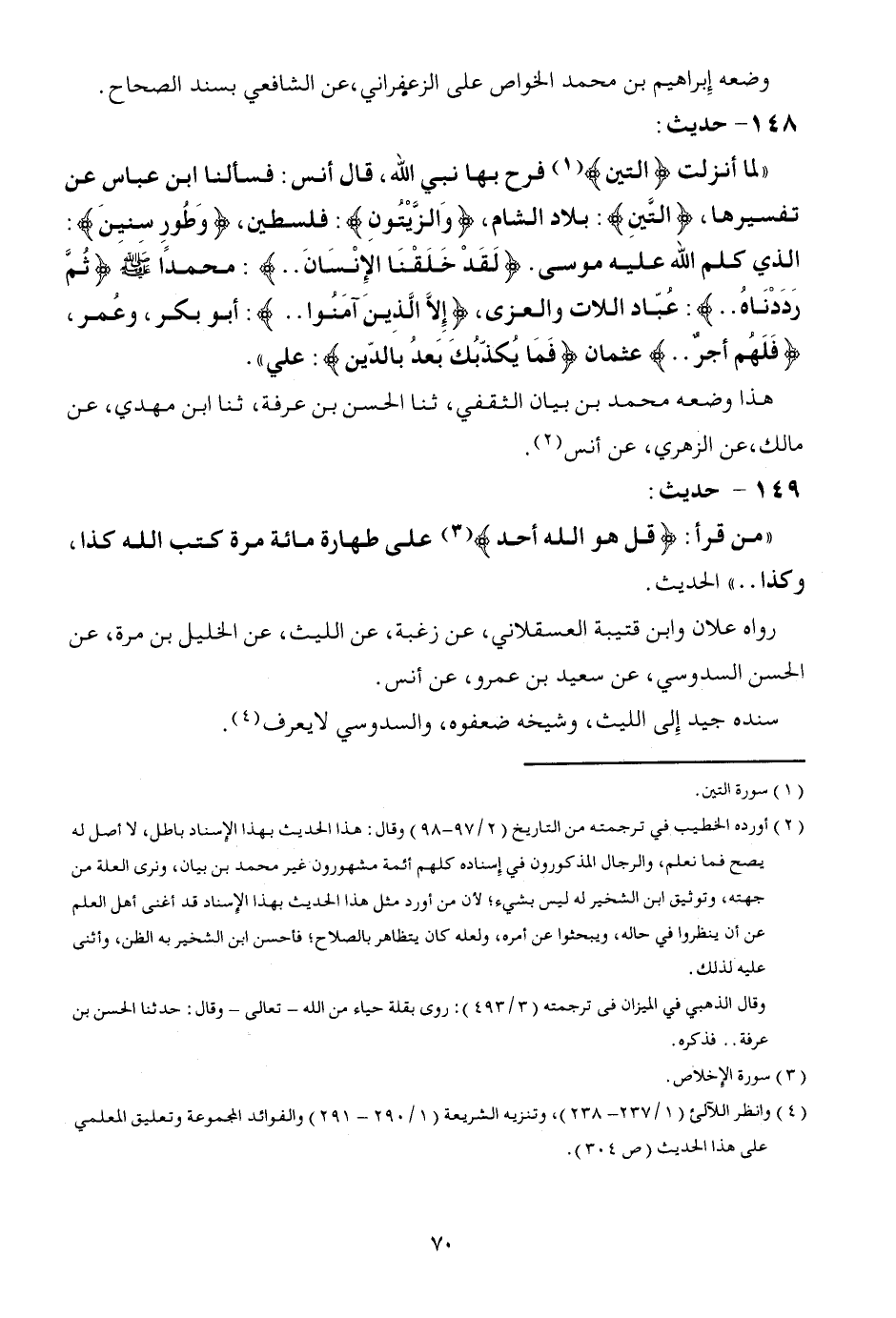 149 - حَدِيث: " من قَرَأَ: {قل هُوَ الله أحد} على طَهَارَة مائَة مرّة كتب الله كَذَا، وَكَذَا ... " الحَدِيث. رَوَاهُ عَلان وَابْن قُتَيْبَة الْعَسْقَلَانِي، عَن زغبة، عَن اللَّيْث، عَن الْخَلِيل بن مرّة، عَن الْحسن السدُوسِي، عَن سعيد بن عَمْرو، عَن أنس. سَنَده جيد إِلَى اللَّيْث، وَشَيْخه ضَعَّفُوهُ، والسدوسي لَا يعرف.